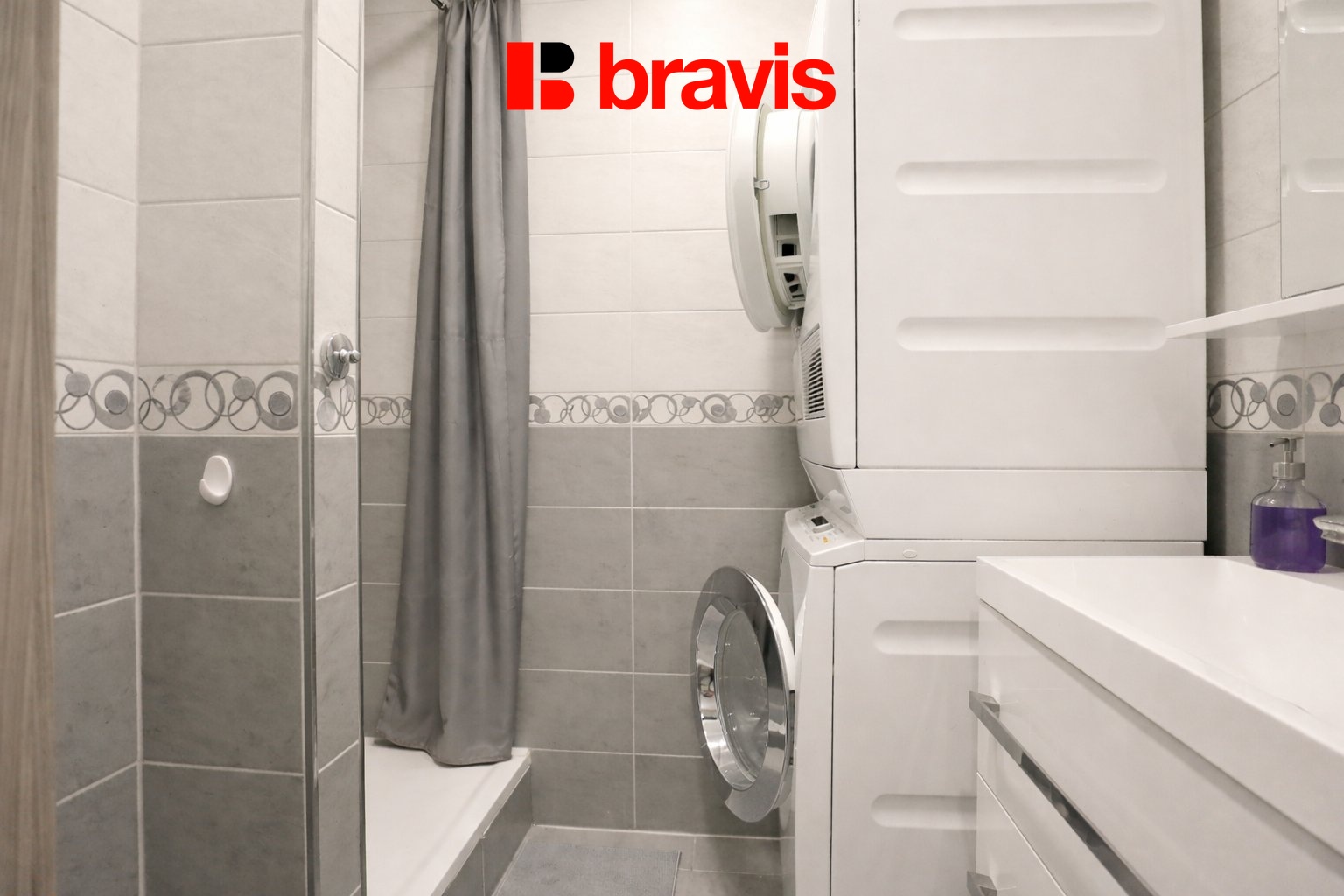 Koupelna je vybavena prostorným sprchovým koutem, umyvadlem, koupelnovou skříňkou, otopným žebříkem a kvalitní pračkou a sušičkou značky Miele. Toaleta je umístěna samostatně.