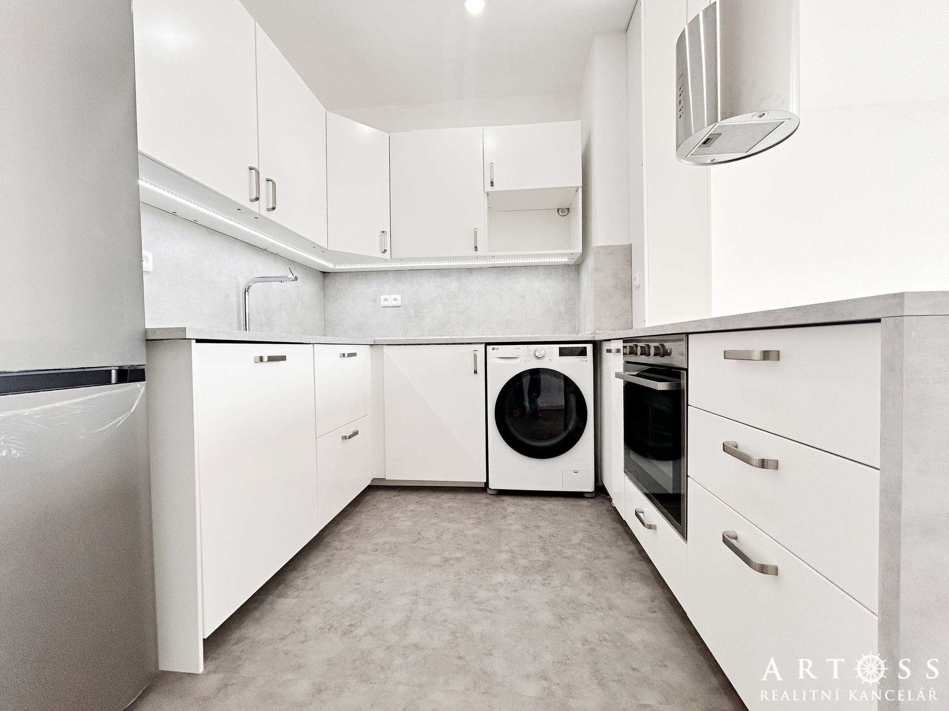 Obývací pokoj s kuchyňským koutem: 28,7 m², vybavený novou linkou se spotřebiči (trouba, myčka nádobí, varná deska, digestoř, pračka).