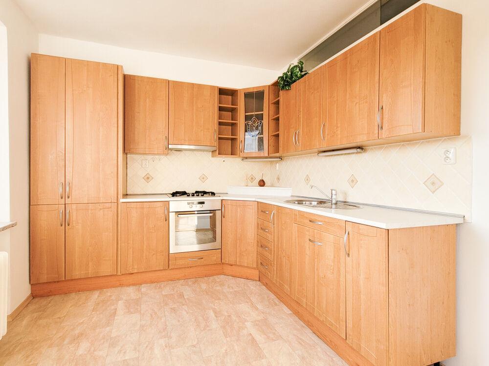 Obývací pokoj je propojený s kuchyní, která je opatřena linkou s vestavěnou varnou deskou, troubou a myčkou na nádobí.