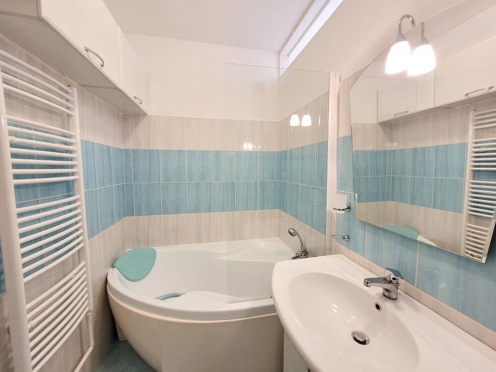 Koupelna má umyvadlo s rohovou vanou.