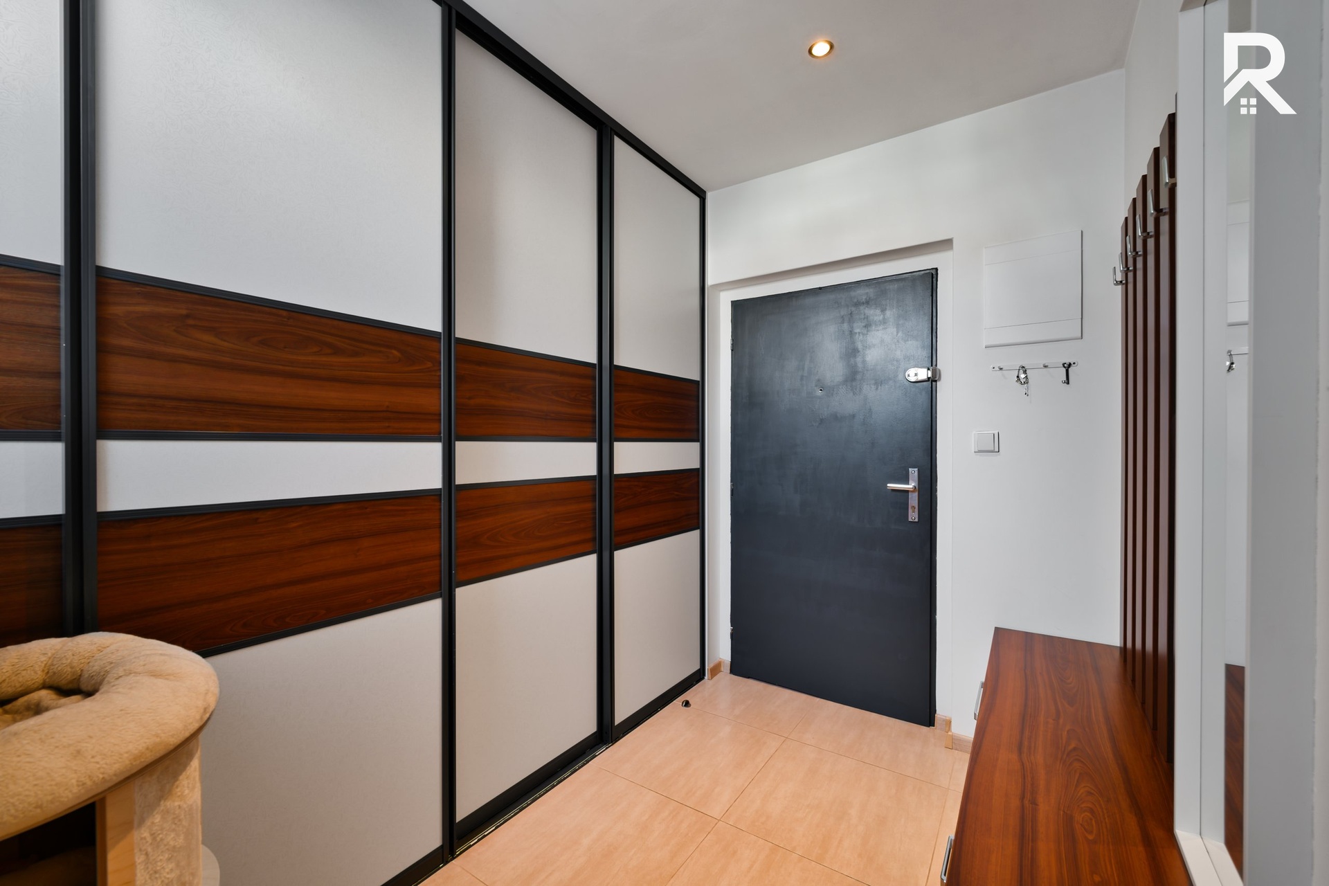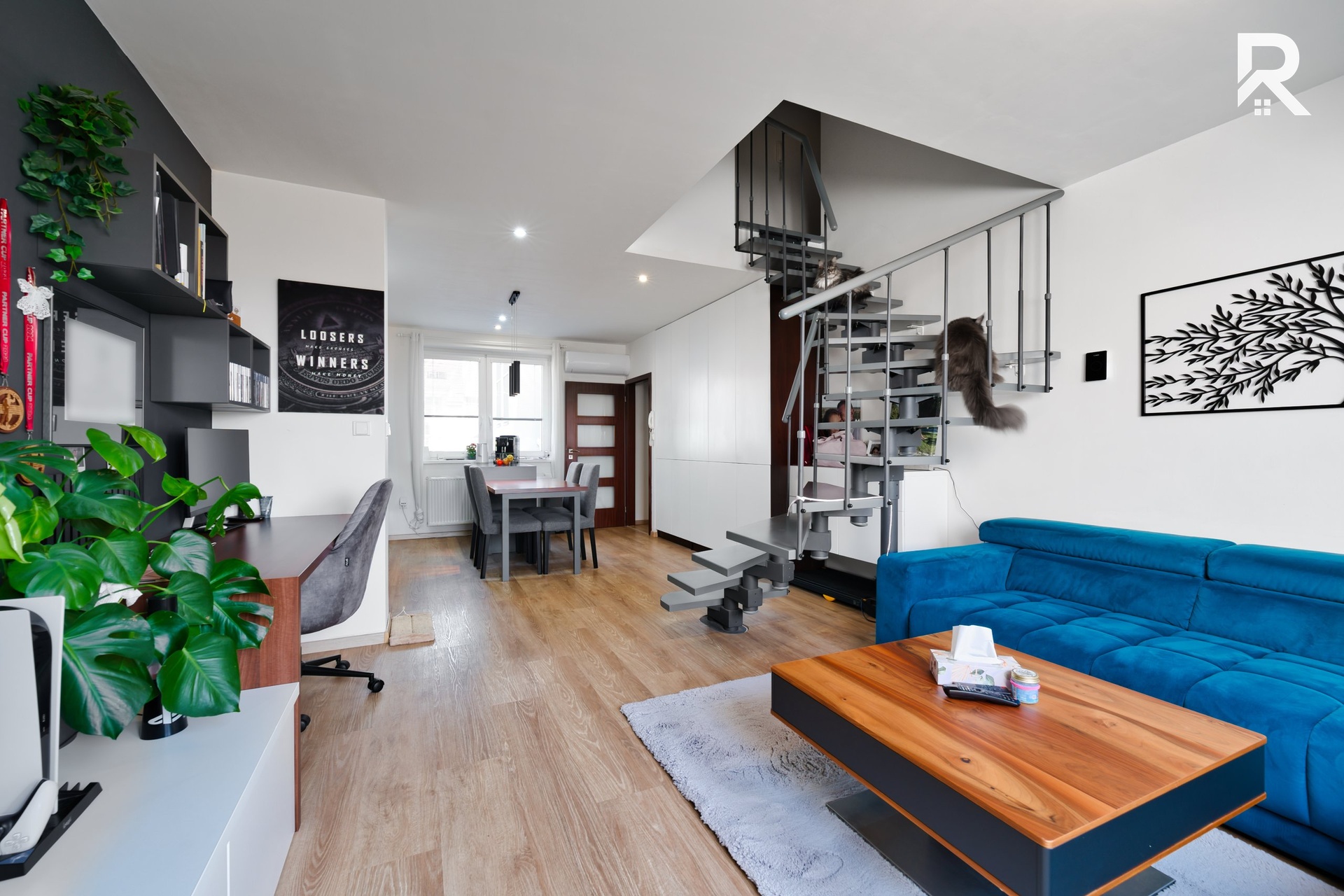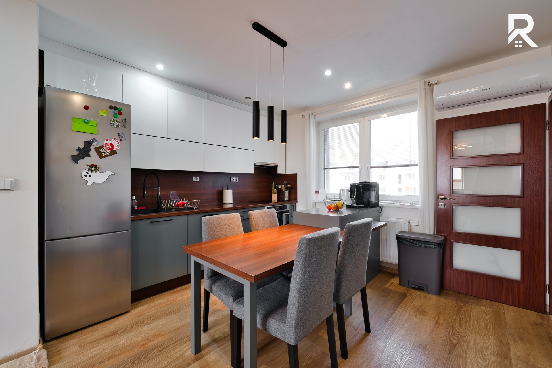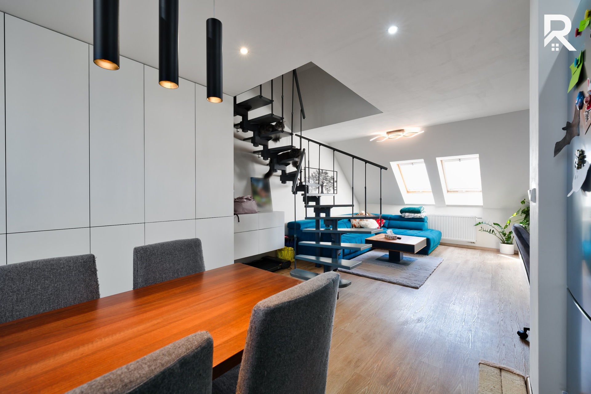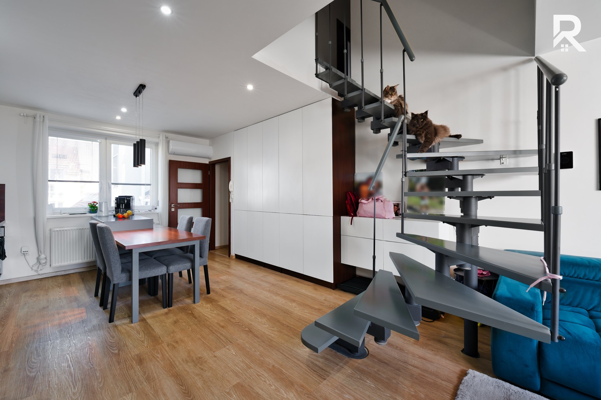 Samotný byt se nachází ve 4. nadzemním podlaží cihlového domu bez výtahu. Už při vstupu Vás přivítá prostorná chodba s dostatkem úložného prostoru v podobě vestavěných skříní, nechybí zde ani pračka a samostatná toaleta. Z chodby se plynule dostanete do dominanty celého bytu – velkorysého obývacího prostoru s kuchyňským koutem, který zaujme nejen svou vzdušností, ale i moderním designem. Kuchyňská linka je plně vybavena všemi spotřebiči, včetně myčky, lednice s mrazákem, trouby, digestoře a indukční varné desky. Obývací část zůstává zařízená – k dispozici je pohodlná sedačka, pracovní kout, TV stěna i televize. Praktickým benefitem je také úložný prostor pod schody, ideální pro uskladnění domácích potřeb či kuchyňského vybavení.
