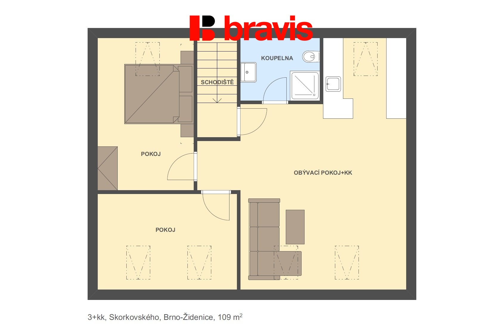 Ve výhradním zastoupení majitele nabízíme k dlouhodobému pronájmu kompletně zařízený byt o dispozici 3+kk na ulici Skorkovského v Brně-Židenicích.