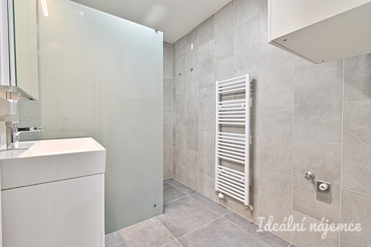 Koupelna je vybavena sprchovým koutem, umyvadlem se skříňkou a místem pro pračku. Toaleta je samostatná.