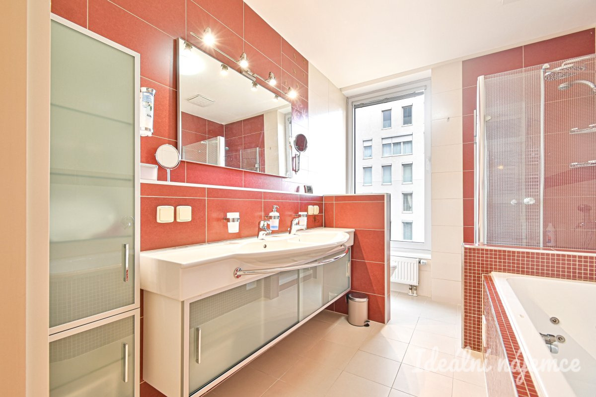 Velkým benefitem je koupelna s prostornou vířivou vanou s masážní funkcí, nad kterou je instalována televize. Koupelna dále nabízí samostatný sprchový kout. Byt disponuje dvěma toaletami – jedna je součástí koupelny, druhá je samostatná a přístupná z chodby.