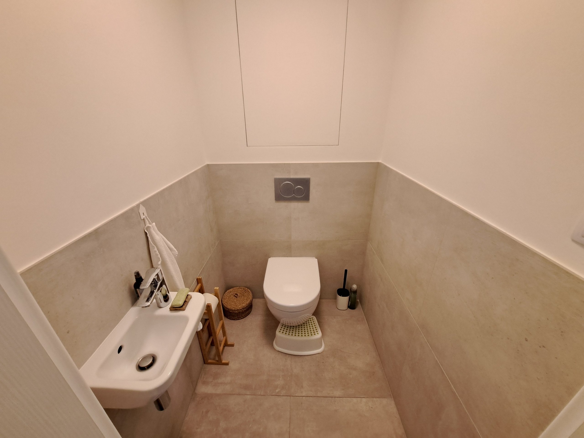 Koupelna (sprchový kout + vodovodní baterie, pračka, zrcadlo, umyvadlo + vodovodní baterie, topný žebřík, větrák, regál, osvětlení). WC (závěsné WC, umývátko + vodovodní baterie).