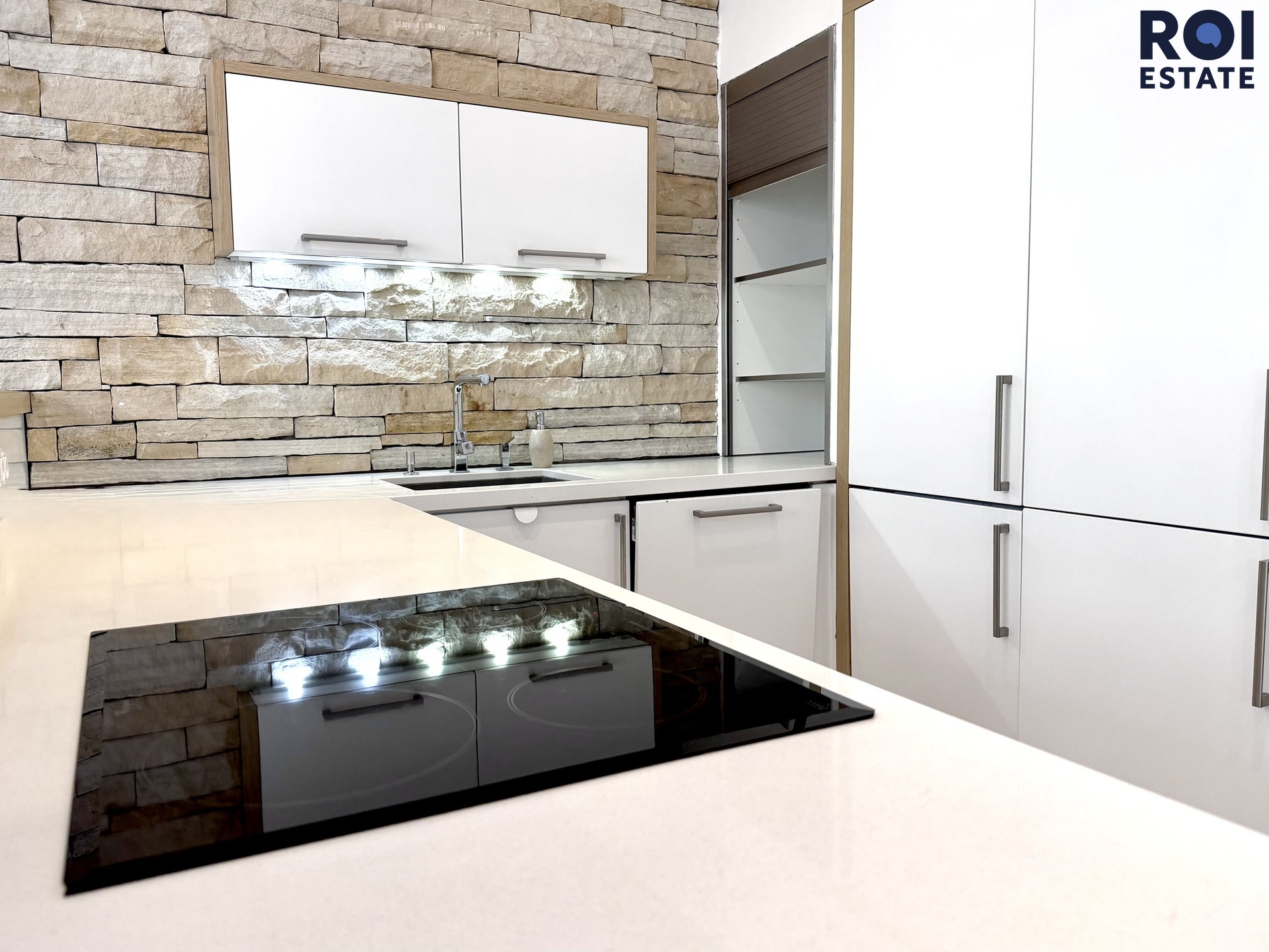 kuchyňská linka s velkým množstvím úložných prostor, vestavěné spotřebiče nejvyšší kvality včetně varné desky, trouby, myčky a lednice, dvě chladničky (klasická a na víno/nápoje), integrovaný kávový koutek s možností skrytí, barový pult s návazností na jídelní prostor