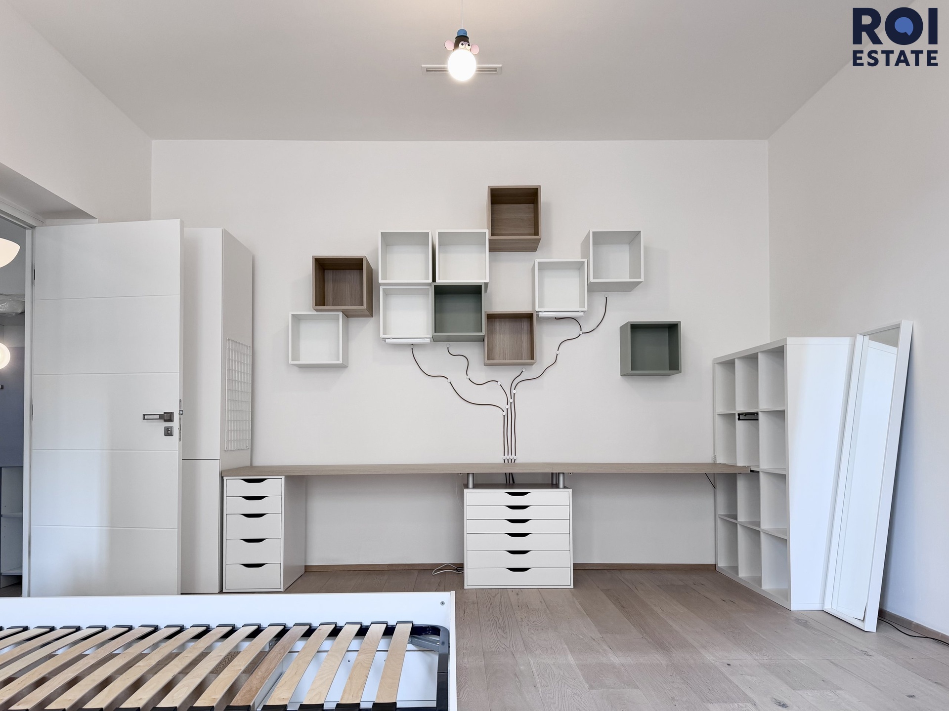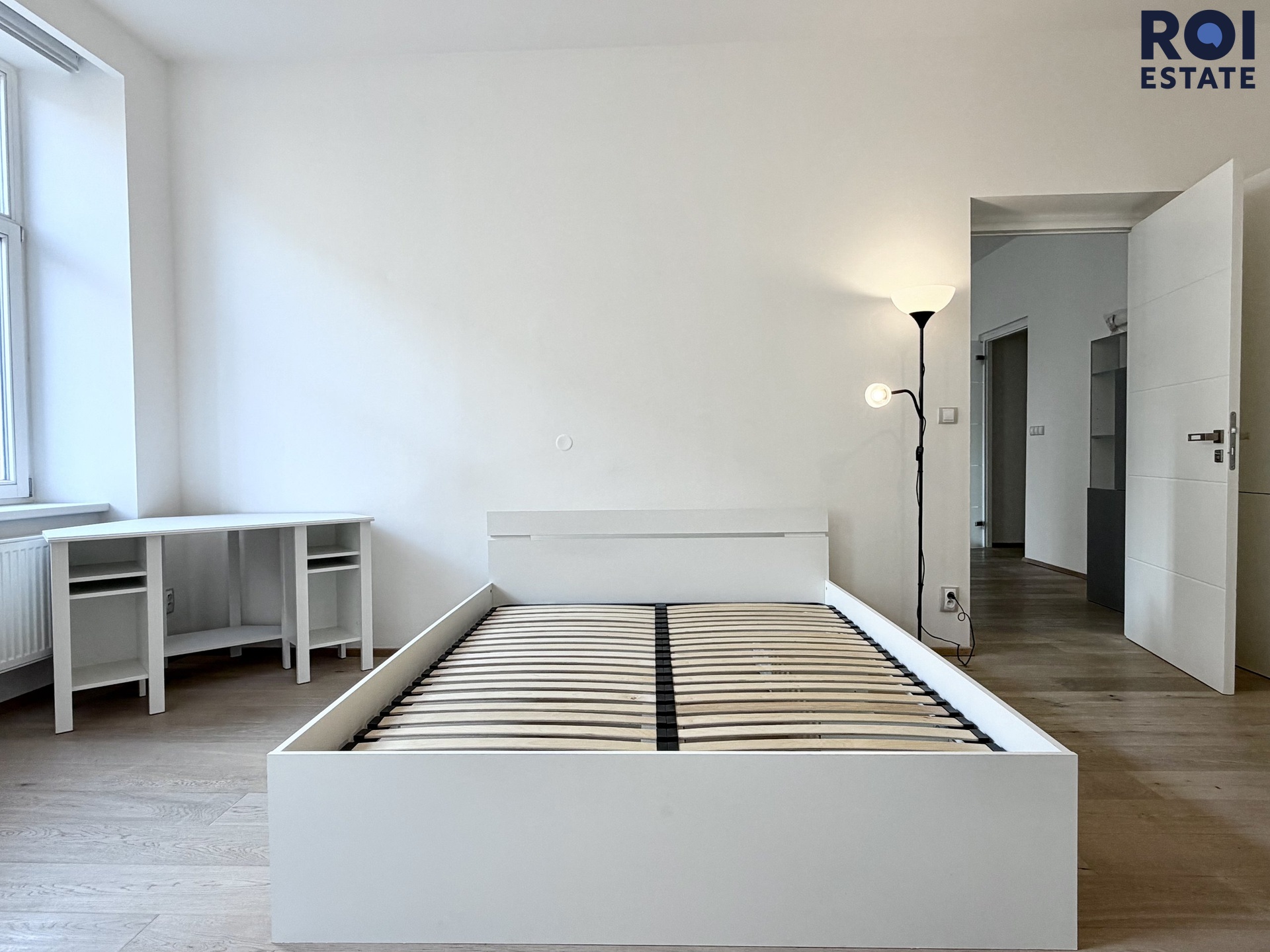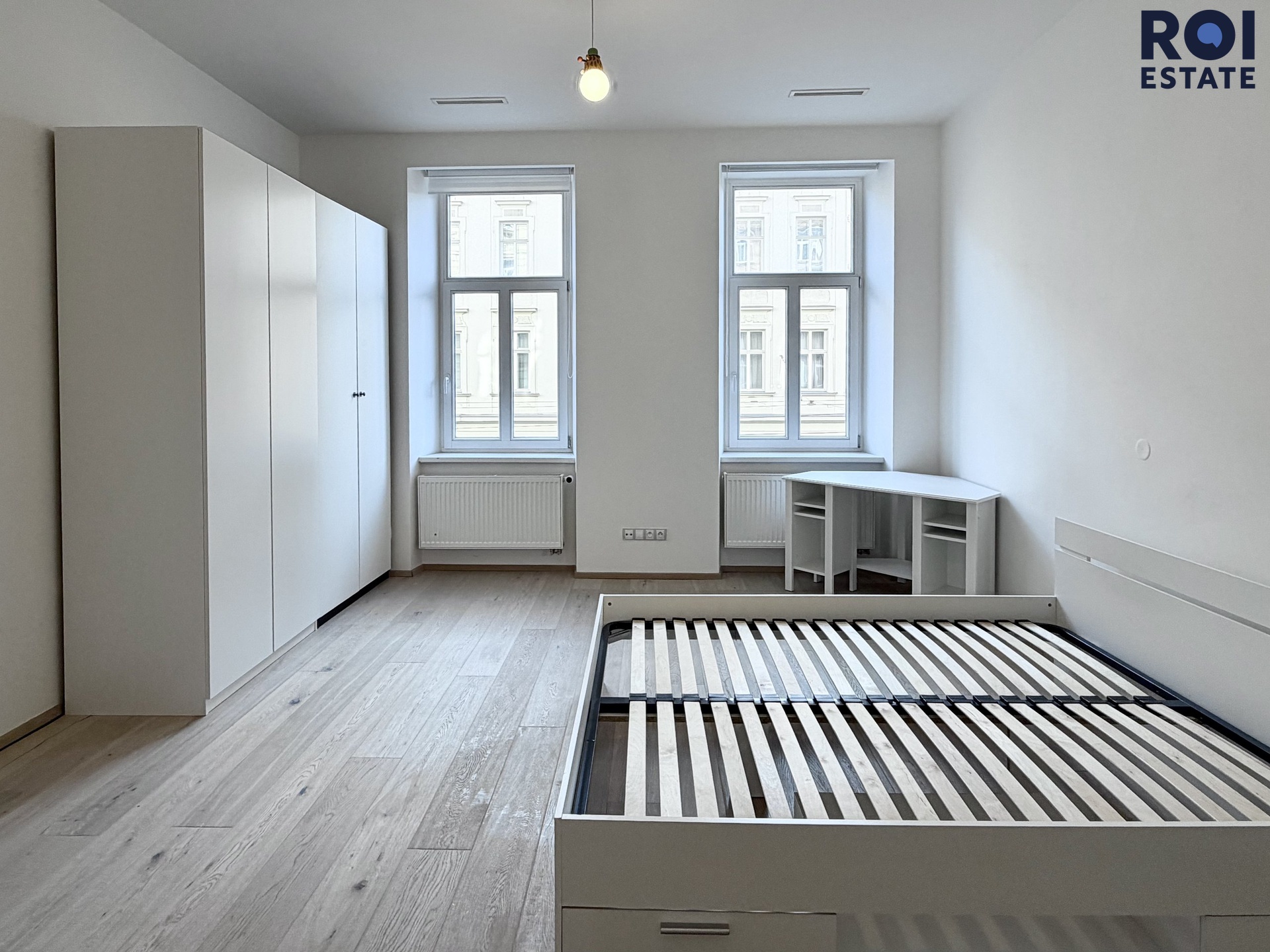 Druhý pokoj do vnitrobloku je prázdný. Třetí pokoj je vybavený postelí, skříněmi i stoly.