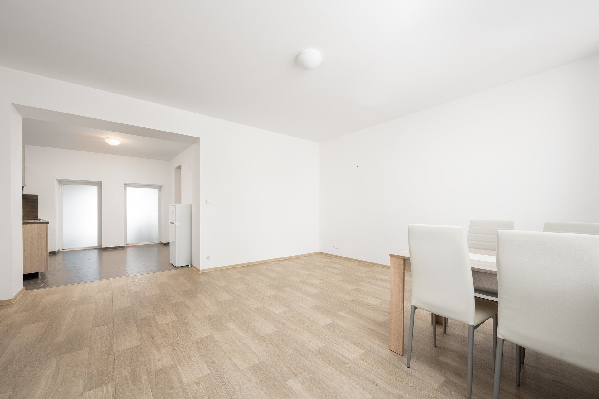 Byt je rozdělen na samostatnou kuchyni s kuchyňskou linkou a větší obývací pokoj. Byt je vybaven pouze jídelním stolem a samostatnou lednicí. Pračka zde není.