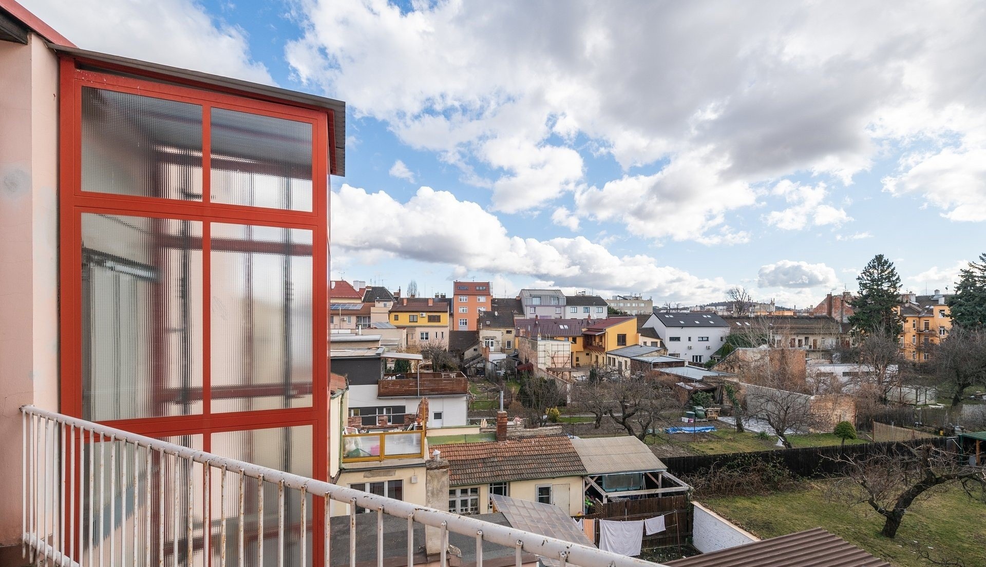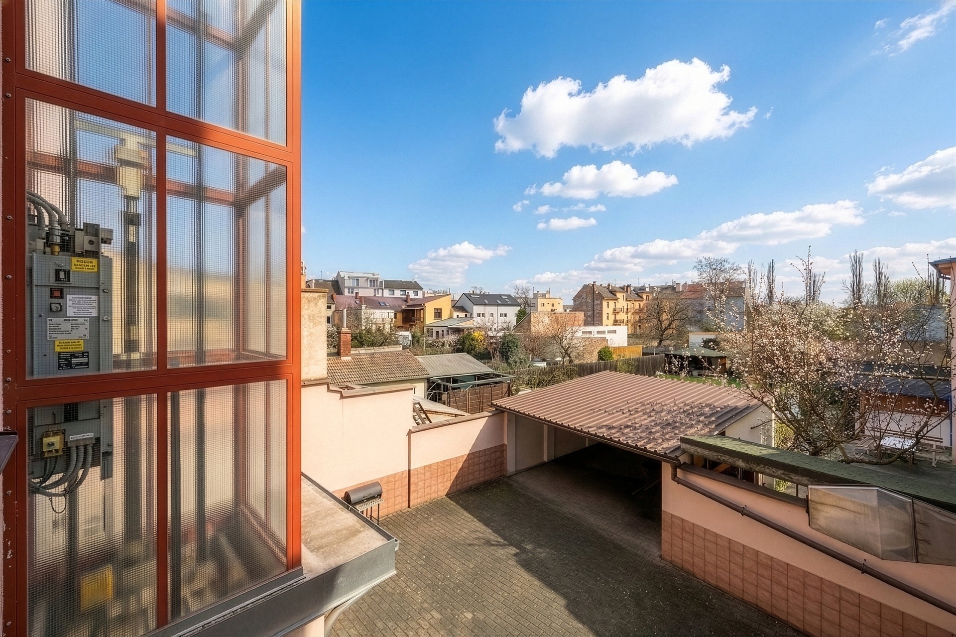 Součástí společných prostor vnitřního traktu domu je také krytý odpočinkový prostor k venkovnímu posezení.