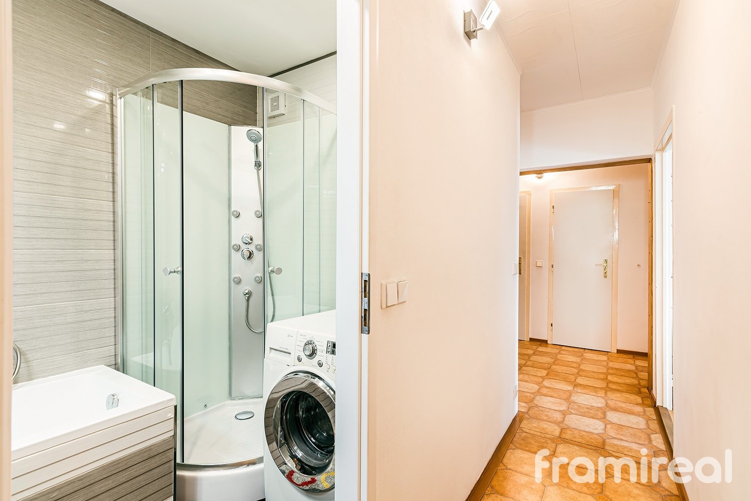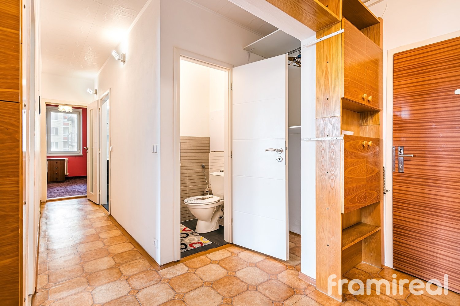 Z ní je přístup do dvou komor, do zrekonstruované kuchyně vybavené moderními spotřebiči, do zrekonstruované koupelny s vanou i sprchovým koutem, do obývacího pokoje a do samostatné ložnice.