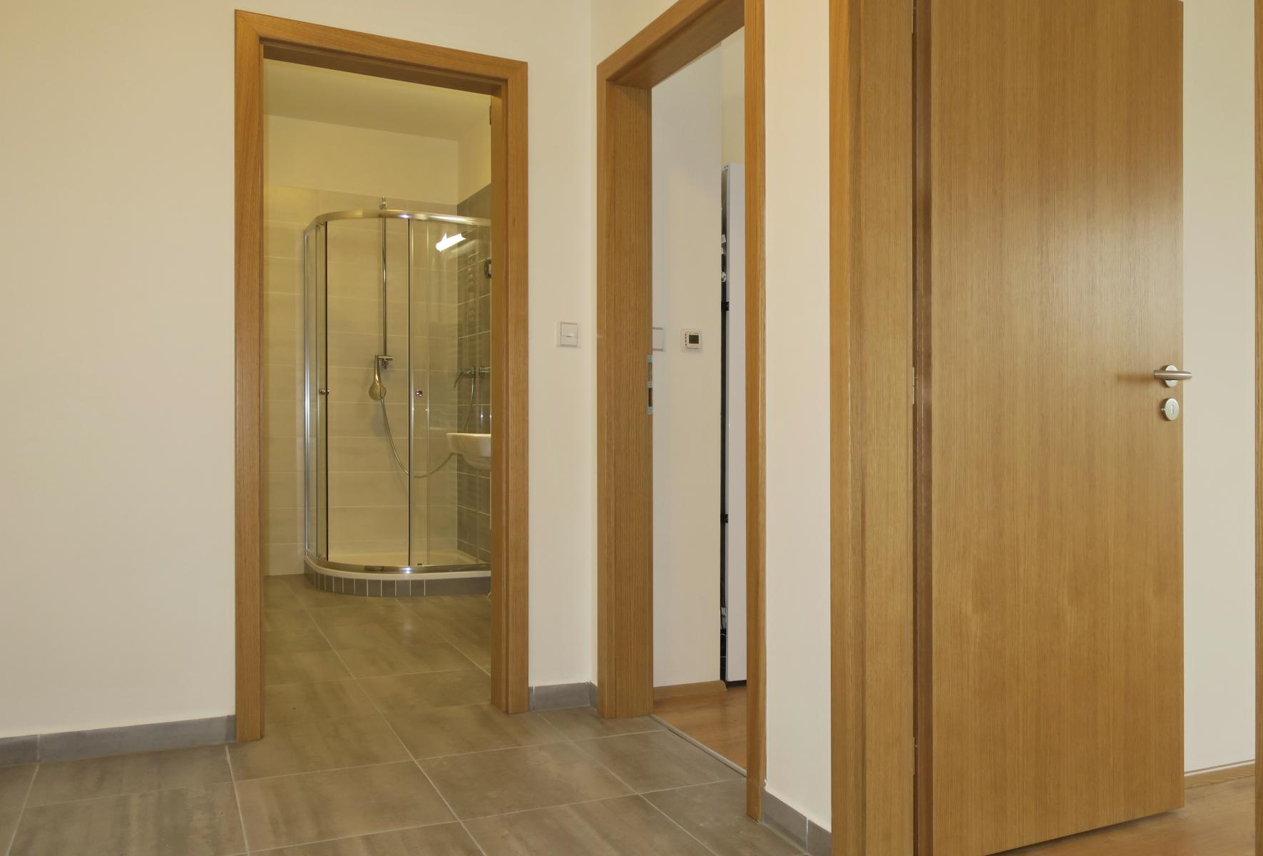 Vstup je do předsíně, ze které jsou přístupné všechny místnosti v bytě - obytný prostor s kuchyňským koutem, pokoj a koupelna se sprchovým koutem, umyvadlem, WC a místem na pračku. K bytu náleží sklep v přízemí domu. Byt je pronajímán jako nezařízený, součástí vybavení bude kuchyňská linka se sklokeramickou varnou deskou, troubou, digestoří a lednicí a žaluzie v oknech. K bytu je možné pronajmout garáž se skladem v domě za cenu 3000 Kč měsíčně.