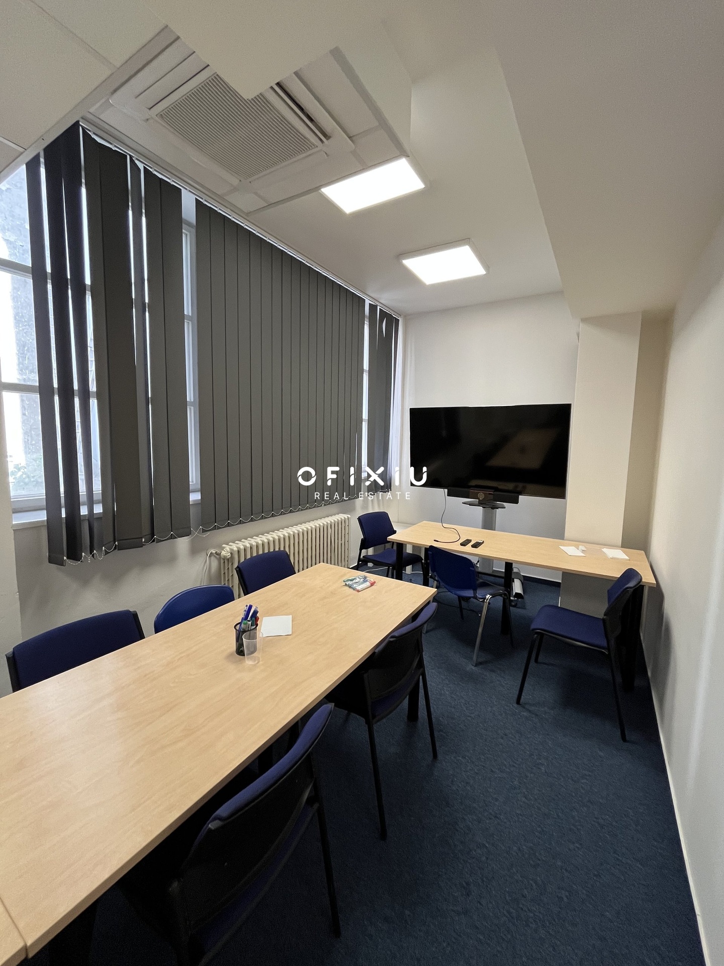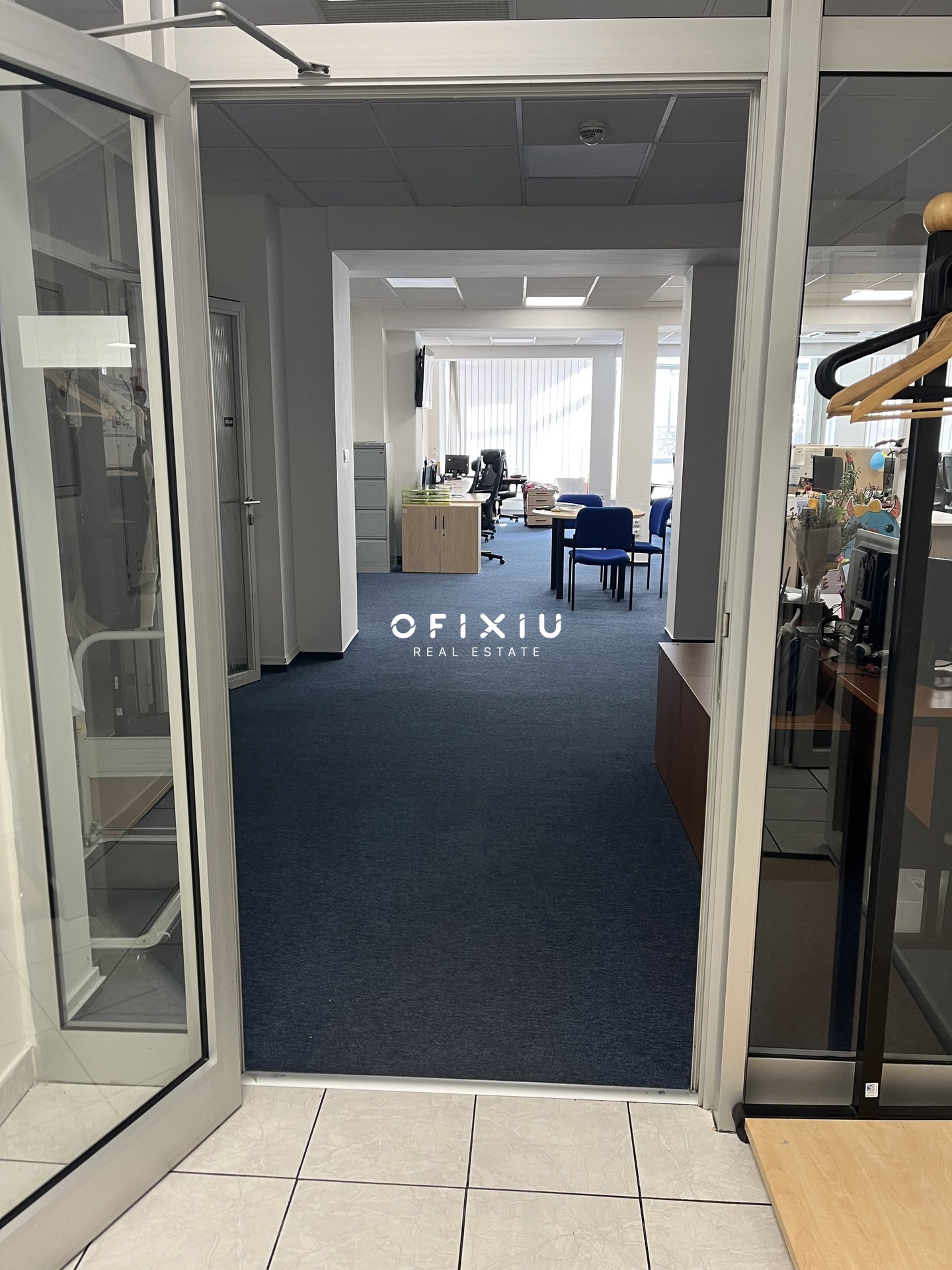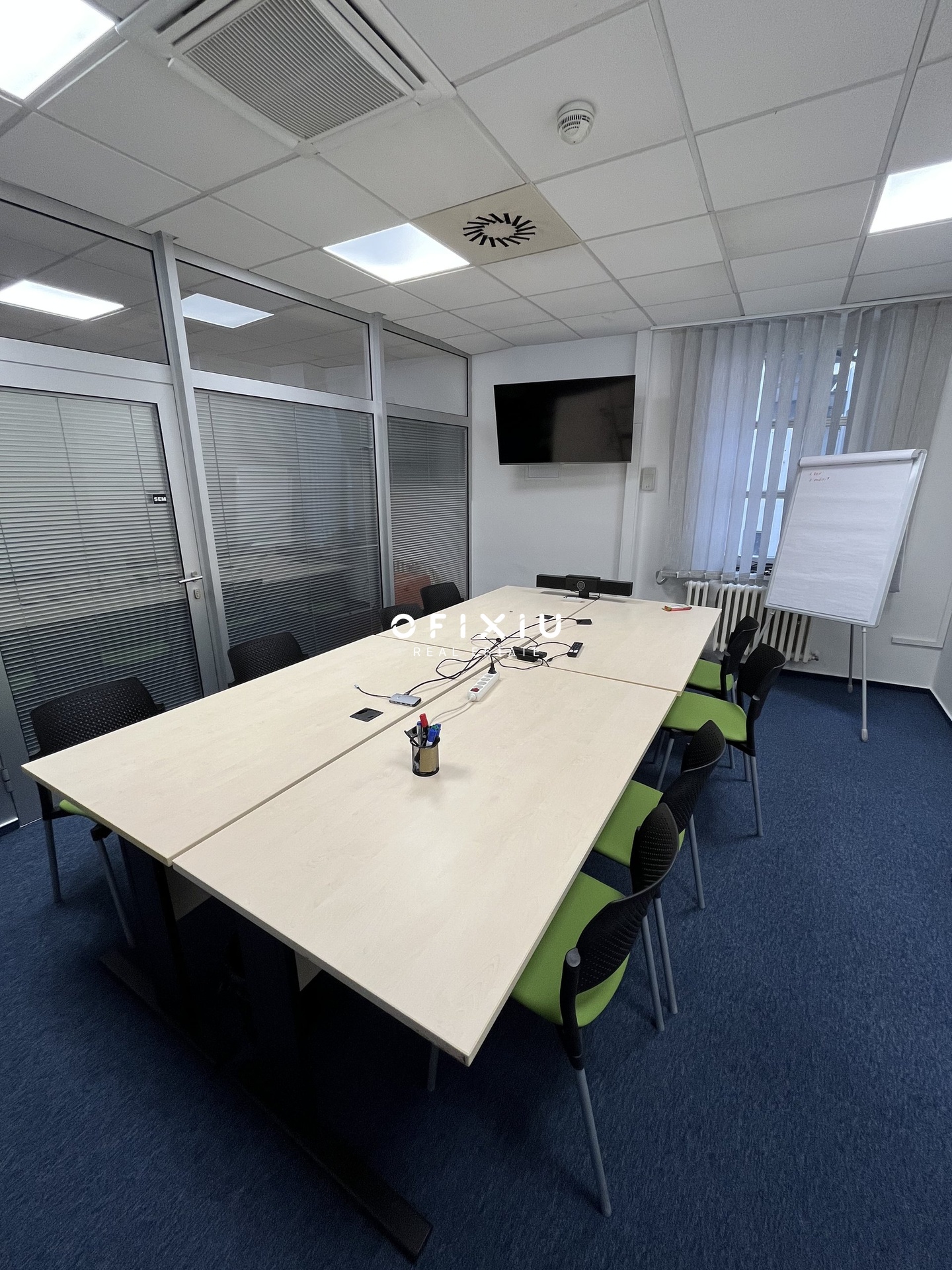 Interiér je světlý, moderní a klimatizovaný, s dostatkem denního světla díky proskleným příčkám.