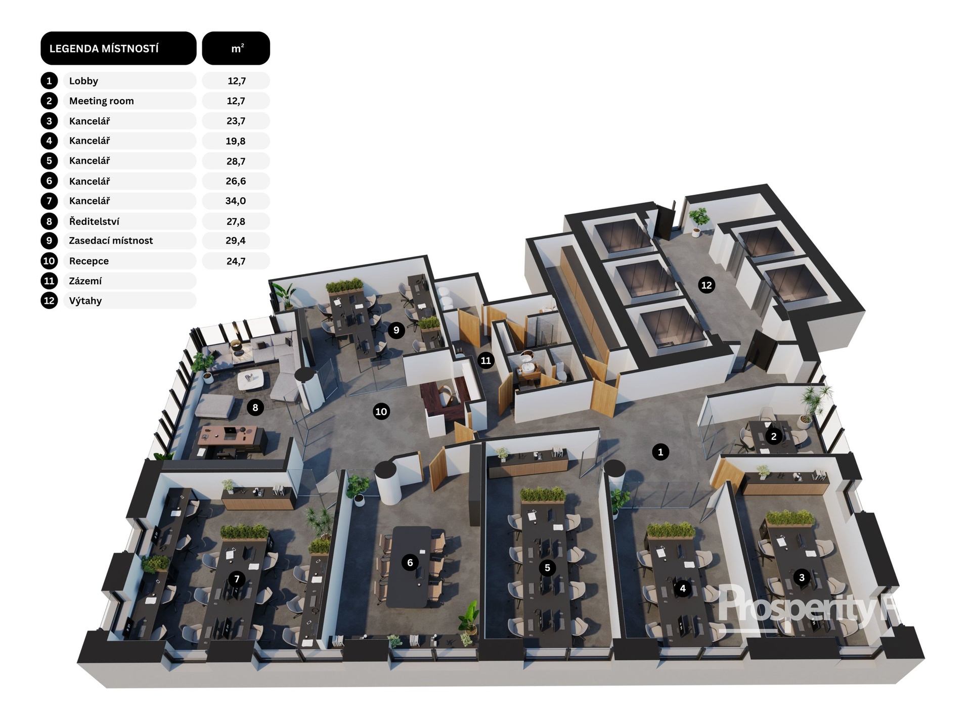 Každá kancelář je plně klimatizovaná, vybavená žaluziemi a vstup je zajištěn přes čipovou kartu.