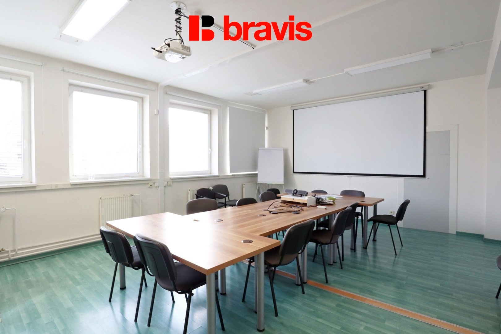 V kancelářích jsou horizontální žaluzie, plovoucí podlahy, rozvody internetu, klimatizace, a budova je vybavena novým LED osvětlením.