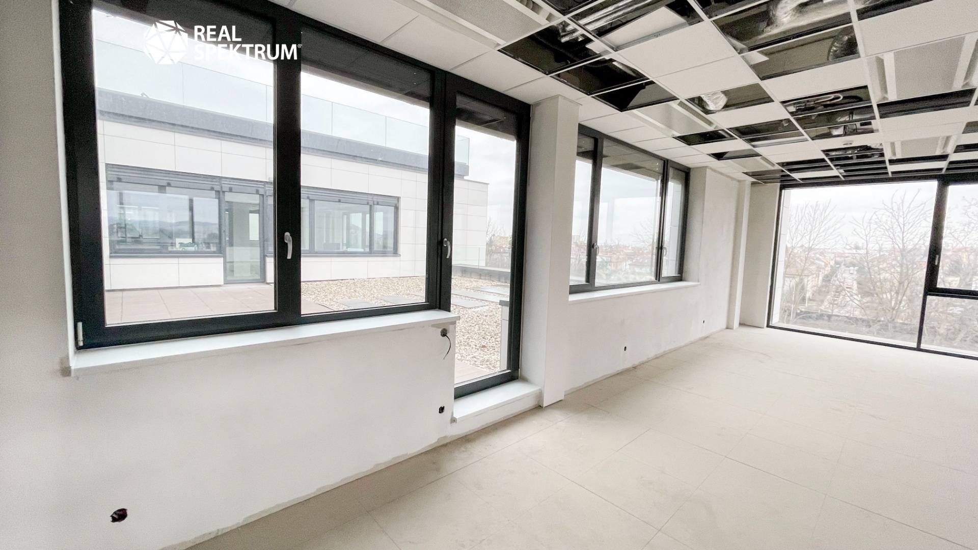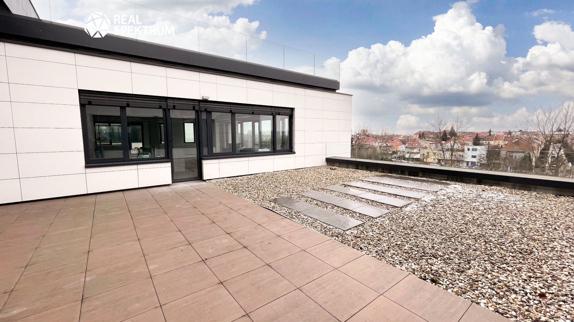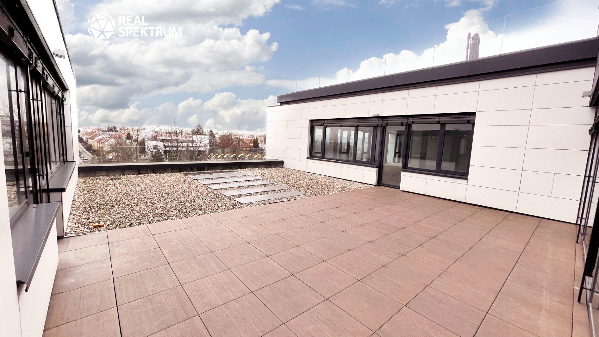 Nabízíme kancelářský celek s celkovou výměrou 274,69 m² a přístupem na venkovní terasu.