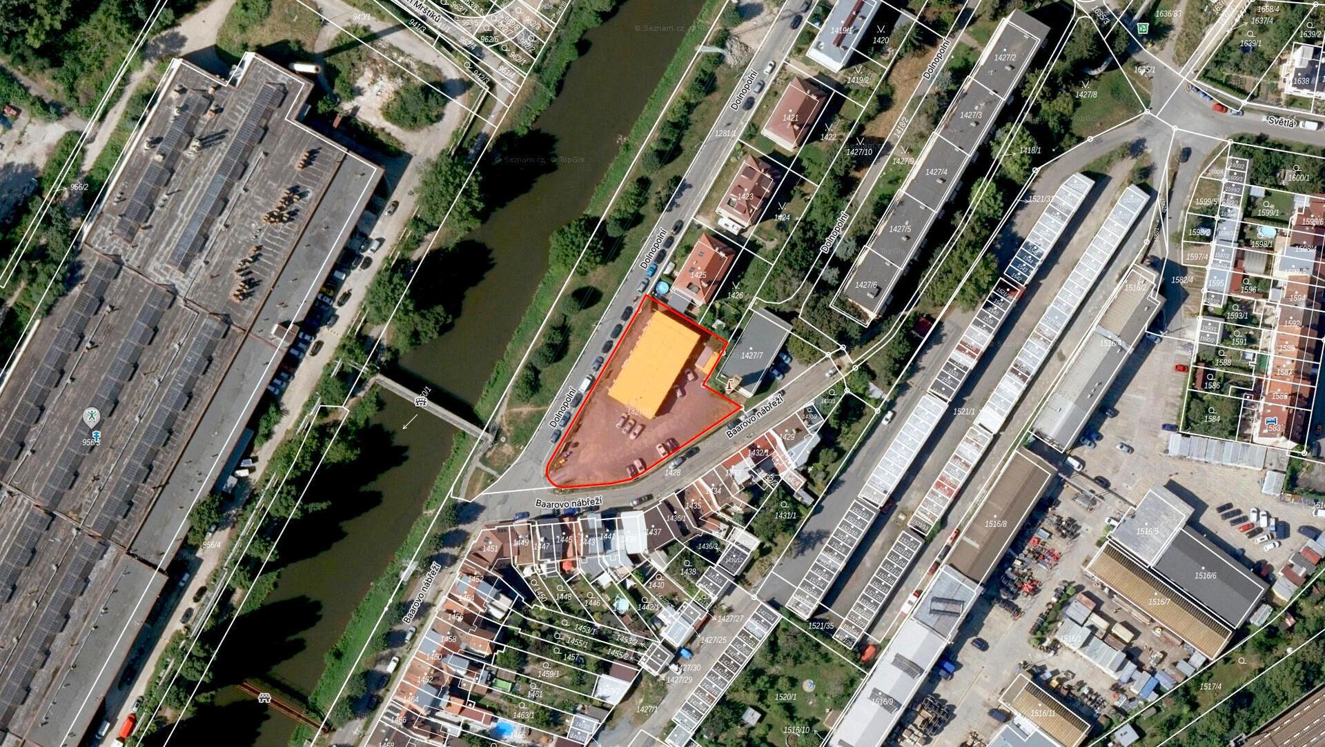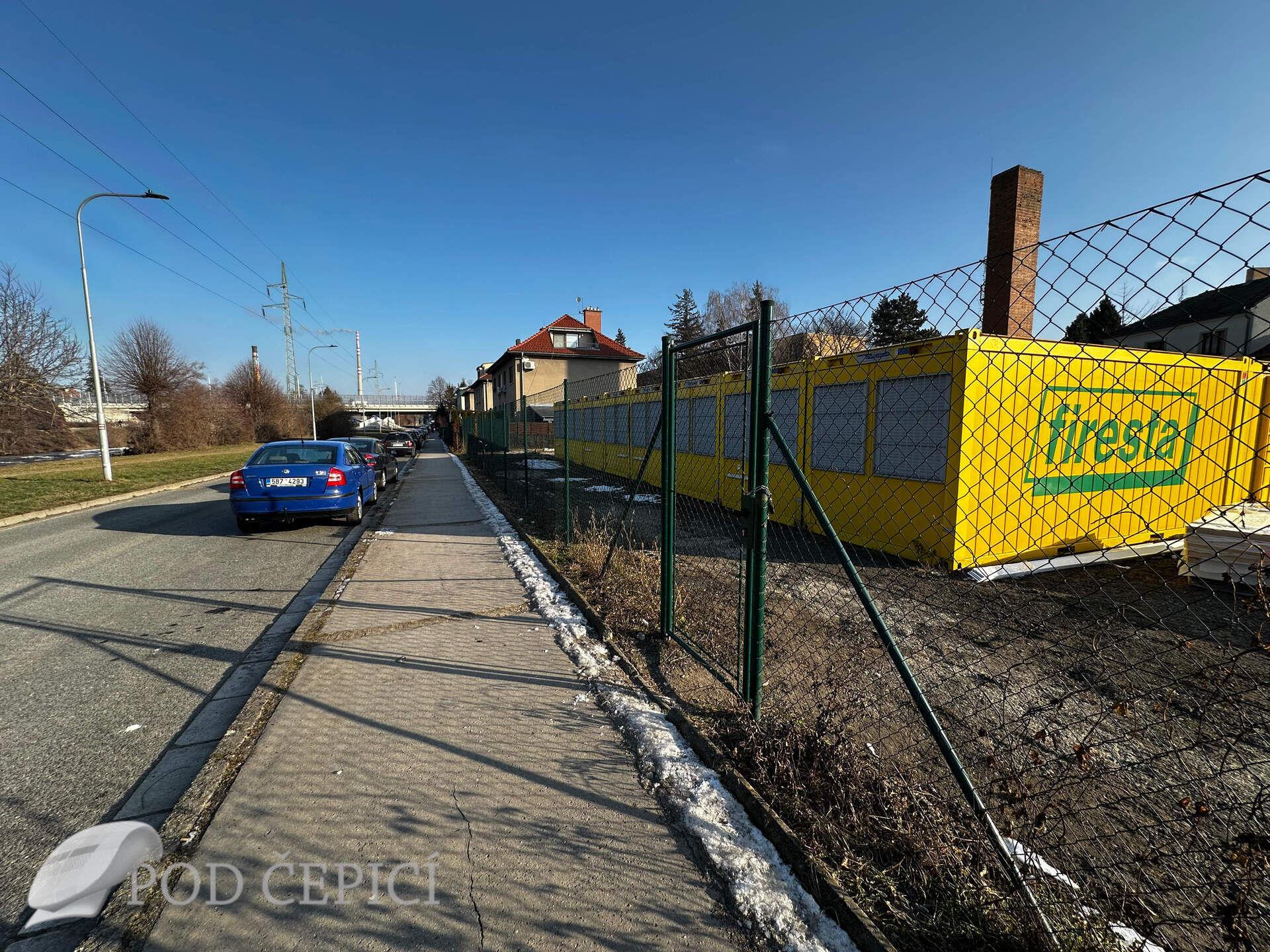 Jak patrno z fotografií, na pozemek lze umístit kontejnery. Současné žluté budou odvezeny. Kontejnery je možné připojit na elektřinu, vodu a kanalizaci (momentálně pomocí dočasných přípojek). Dle územního plánu je parcela částečně v zóně všeobecného bydlení a částečně ve veřejném prostranství.