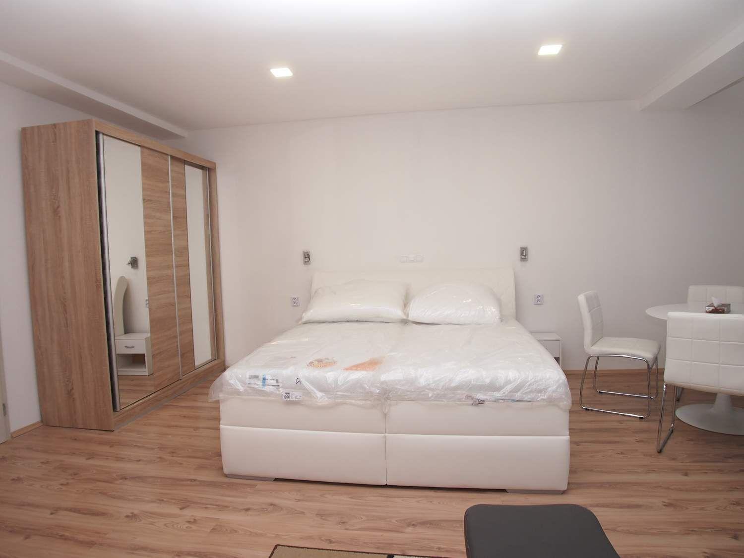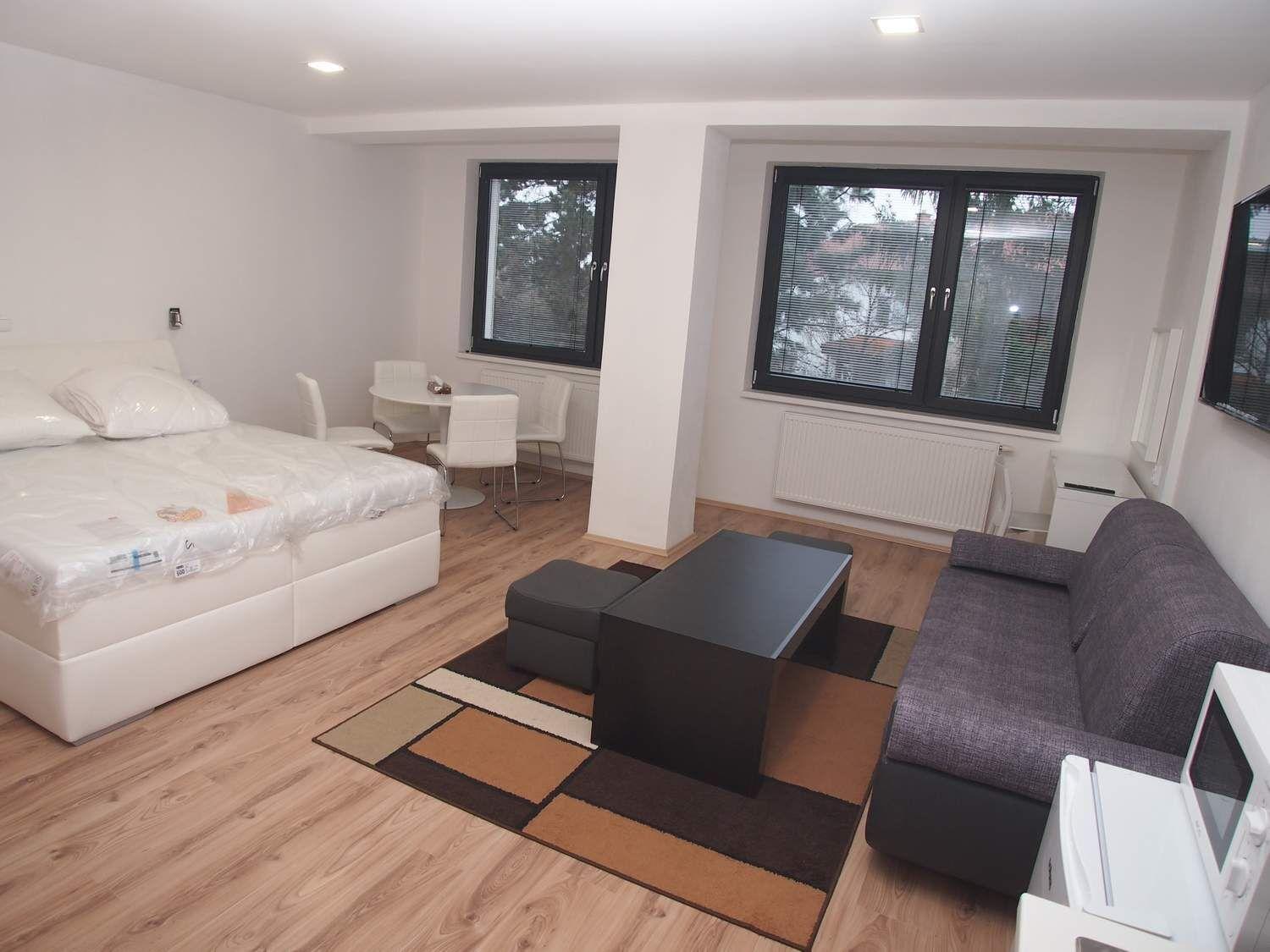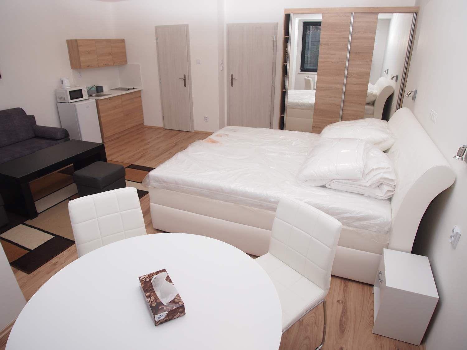 Menší apartmánový dům, pouze s 5-ti byty, nabízí klidné bydlení ve vilové části města. Apartmán 30m2 je vybaven kuchyňkou se sklokeramickou varnou deskou, lednicí, mikrovlnnou troubou, rychlovarnou konvicí, základním nádobím, TV, dvoulůžkem, rozkládací sedačkou s možností dalšího přespání, šatní skříní, vlastní koupelnou se sprchovým koutem a WC.