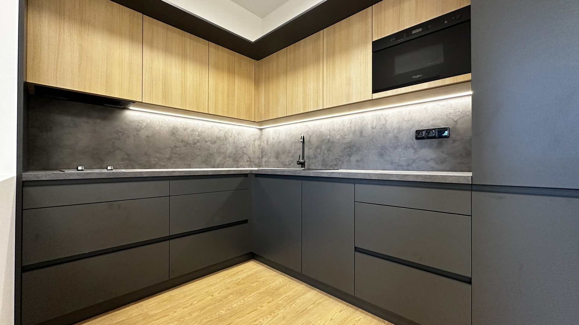 Apartmán se pronajímá částečně vybavený – k dispozici je nová kuchyňská linka s elegantní kombinací černé a dřeva, včetně spotřebičů (myčka, lednice, varná deska, trouba, mikrovlnka). Obytný prostor působí vzdušně díky vysokým oknům a světlým podlahám. Koupelna je moderní a prostorná – sprchový kout, umyvadlová skříňka, toaleta a pračka.