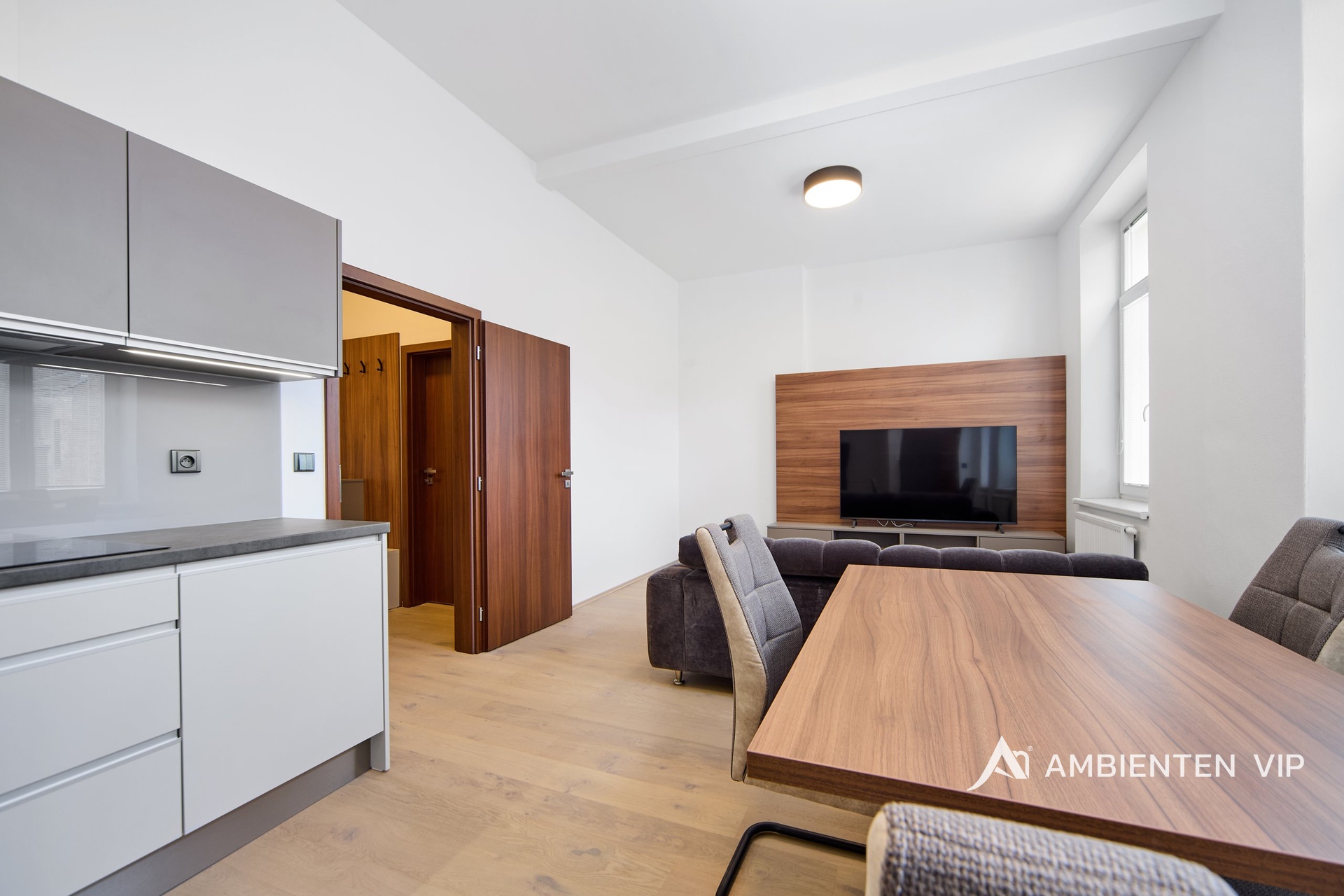 Kuchyňská část je zařízena kuchyňskou linkou s vestavnými spotřebiči: indukční deska, el. trouba, digestoř, myčka, mikrovlnná strouba, lednice s mrazákem a jídelním stolem s židlemi. Obývací část vybavena sedací soupravou, konferenčním stolkem, televizní stěnou s TV.