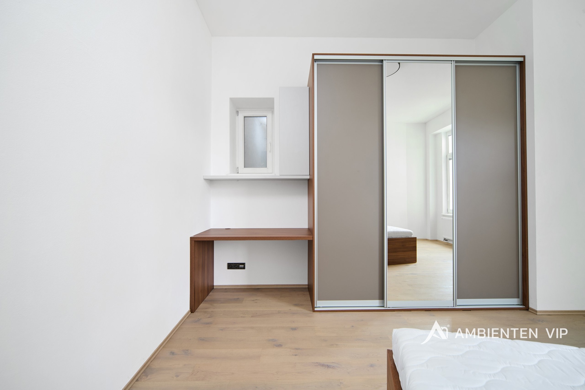 Ložnice je zařízená dvoulůžkovou manželskou postelí a vestavěnými skříněmi. K dispozici je dále prostorná šatna. Koupelna disponuje sprchovým koutem, umyvadlem se skříňkou, zrcadlem a pračkou. Předsíň je vybavena vestavěnou skříní. Internet je již zahrnut v ceně.