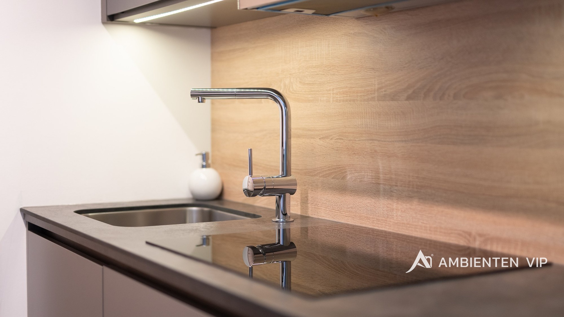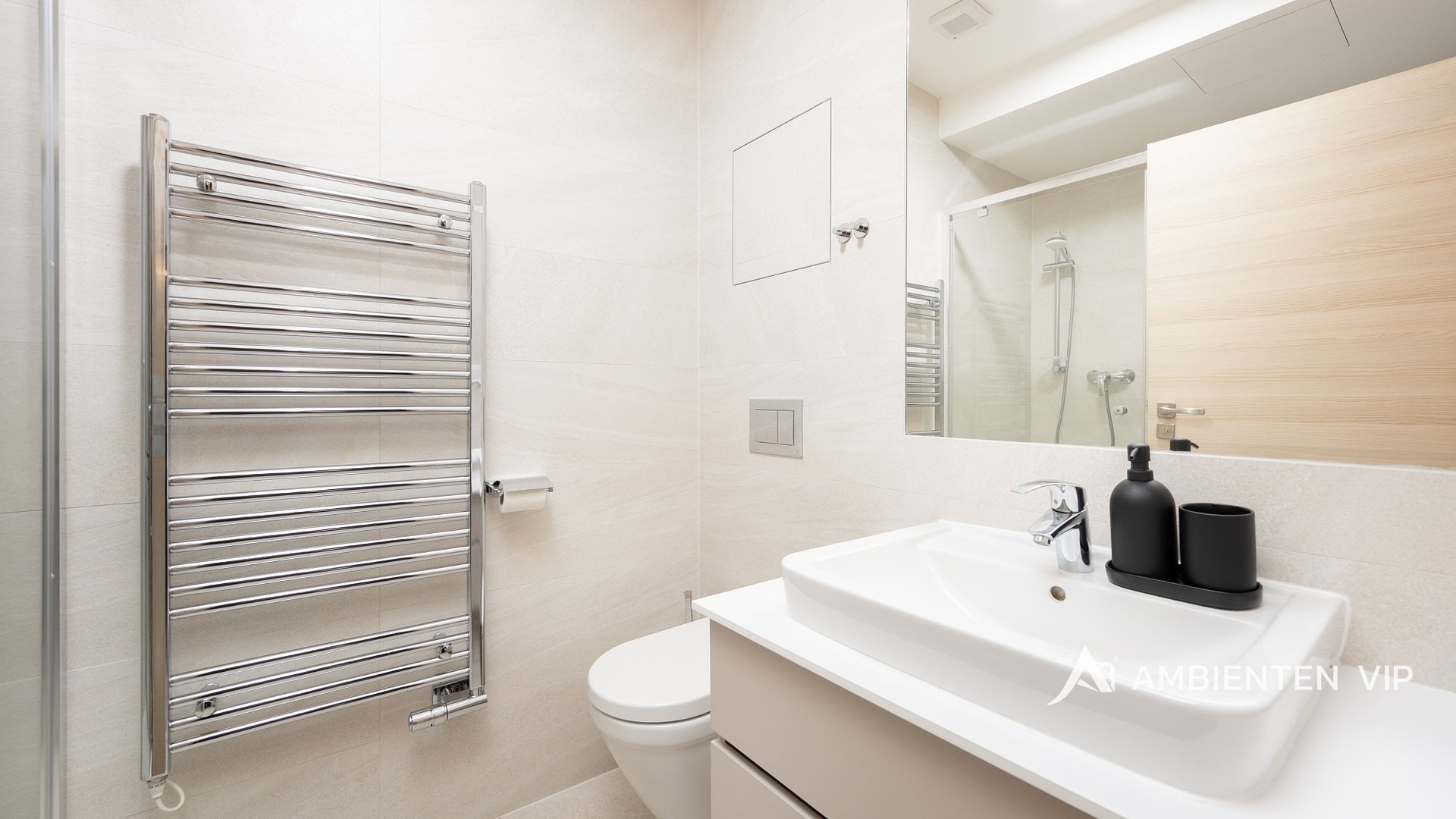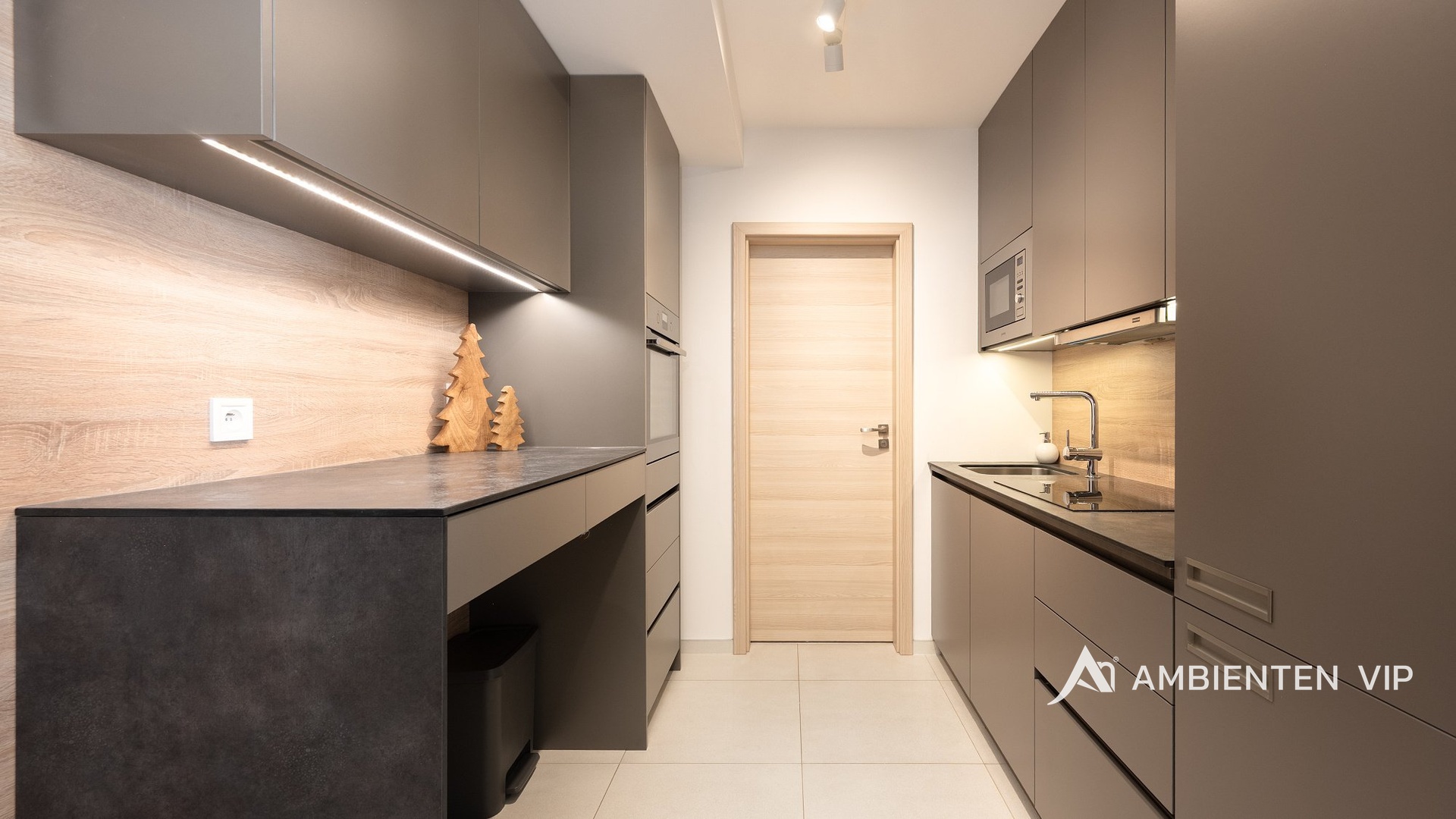 Kuchyňská linka je plně vybavena, součástí je lednice, indukční varná deska, mrazák, myčka, mikrovlnná trouba, trouba. V koupelně se také samozřejmě nachází nová pračka a sušička značky LG.