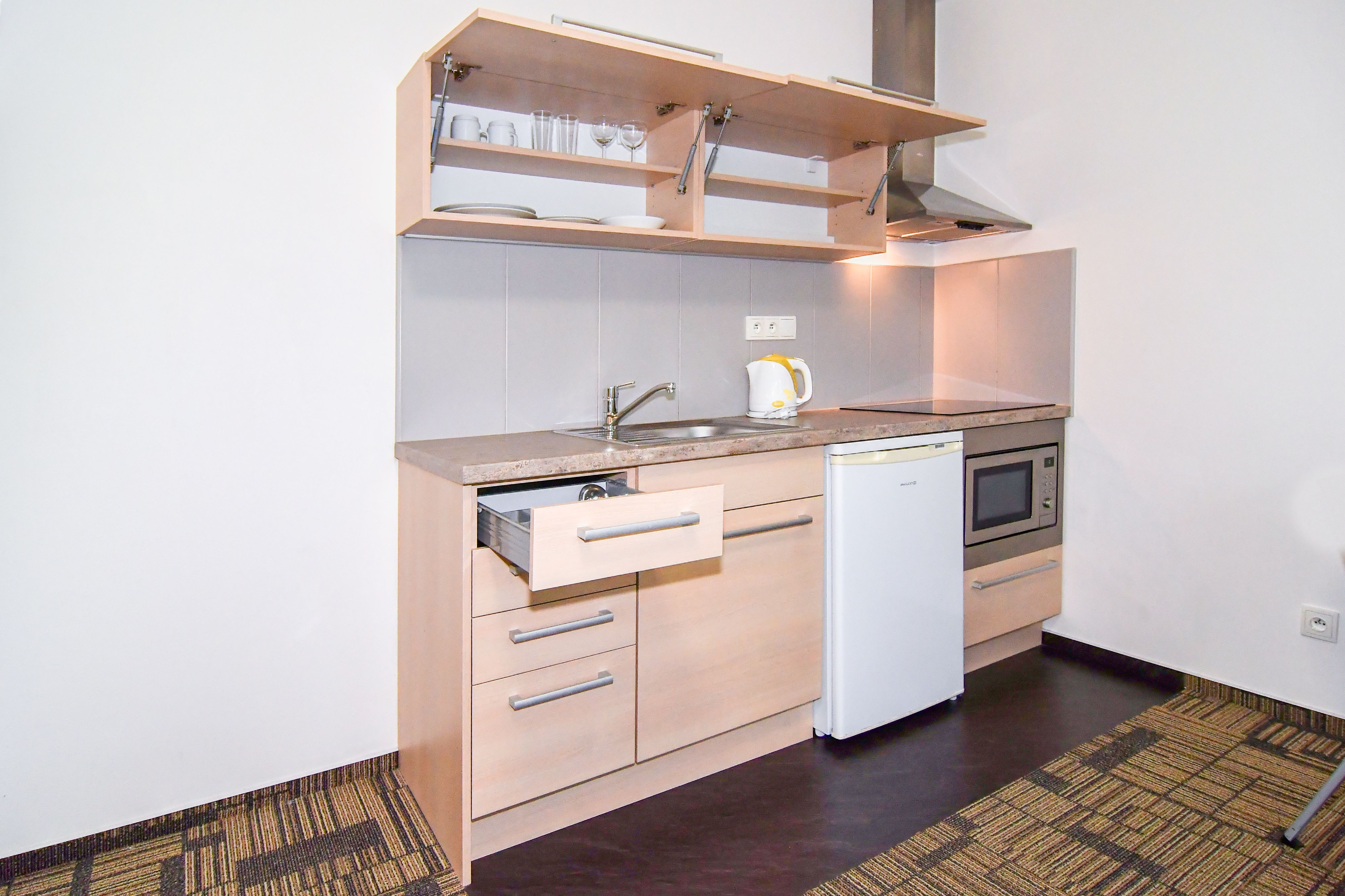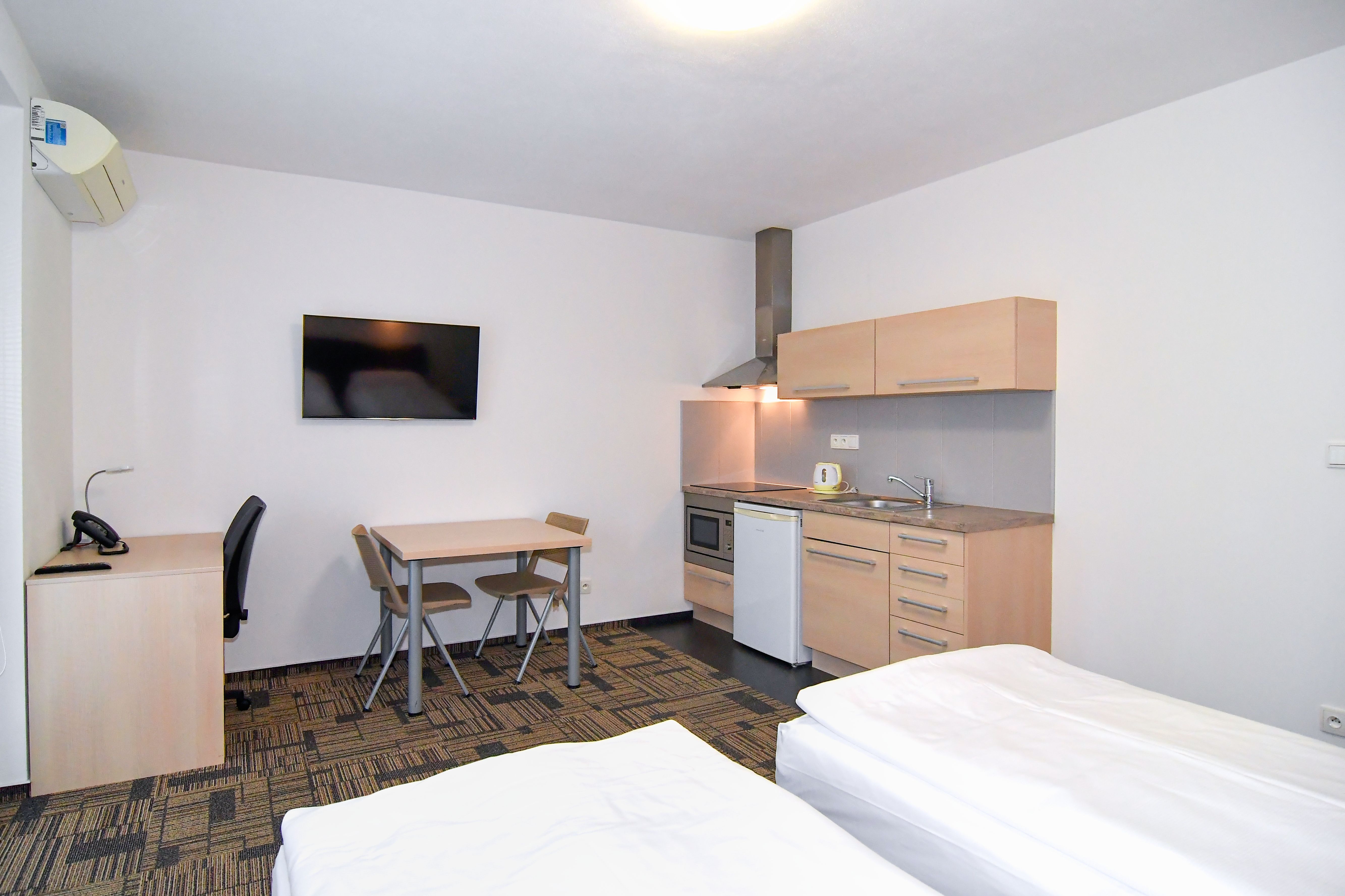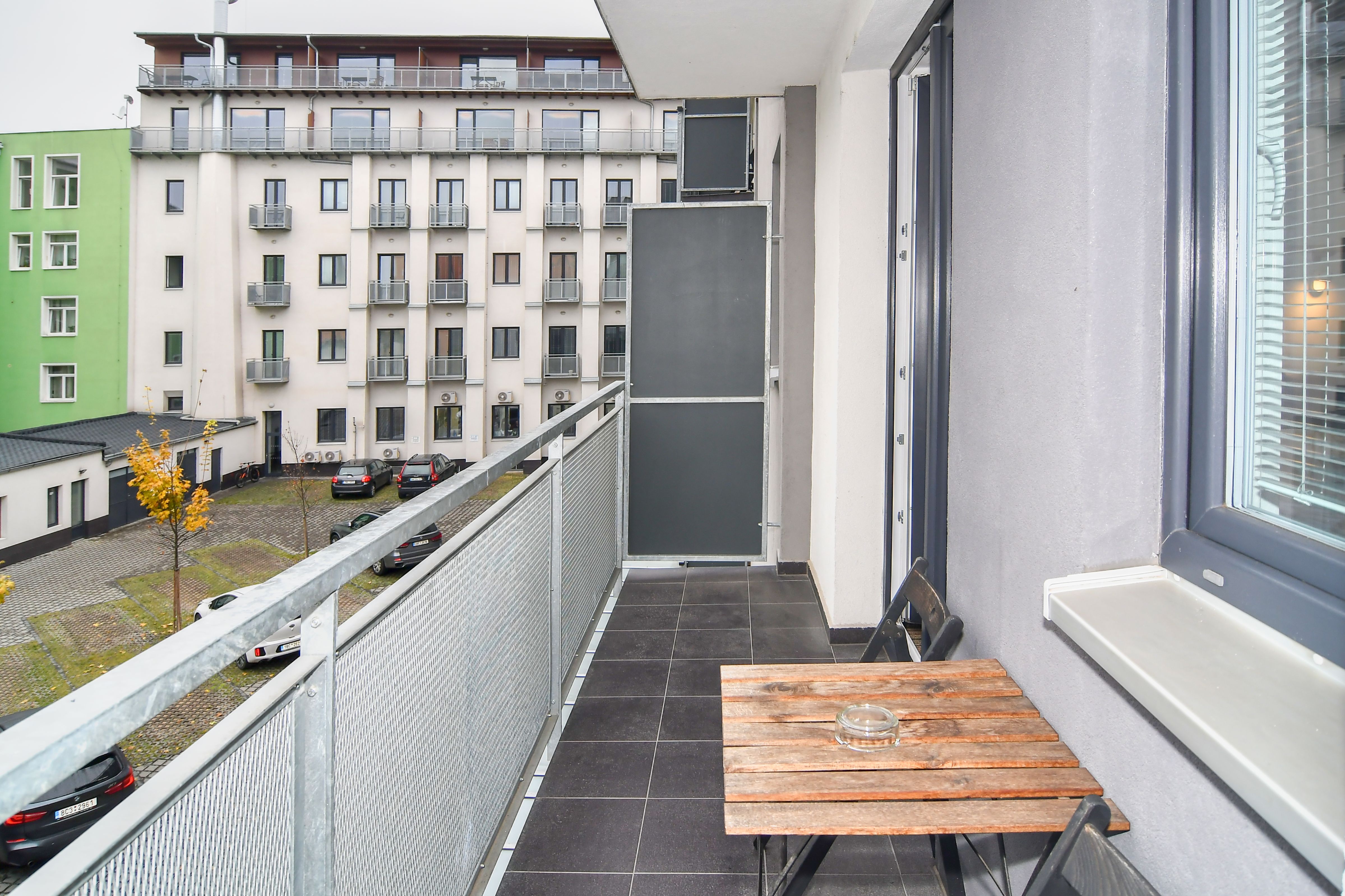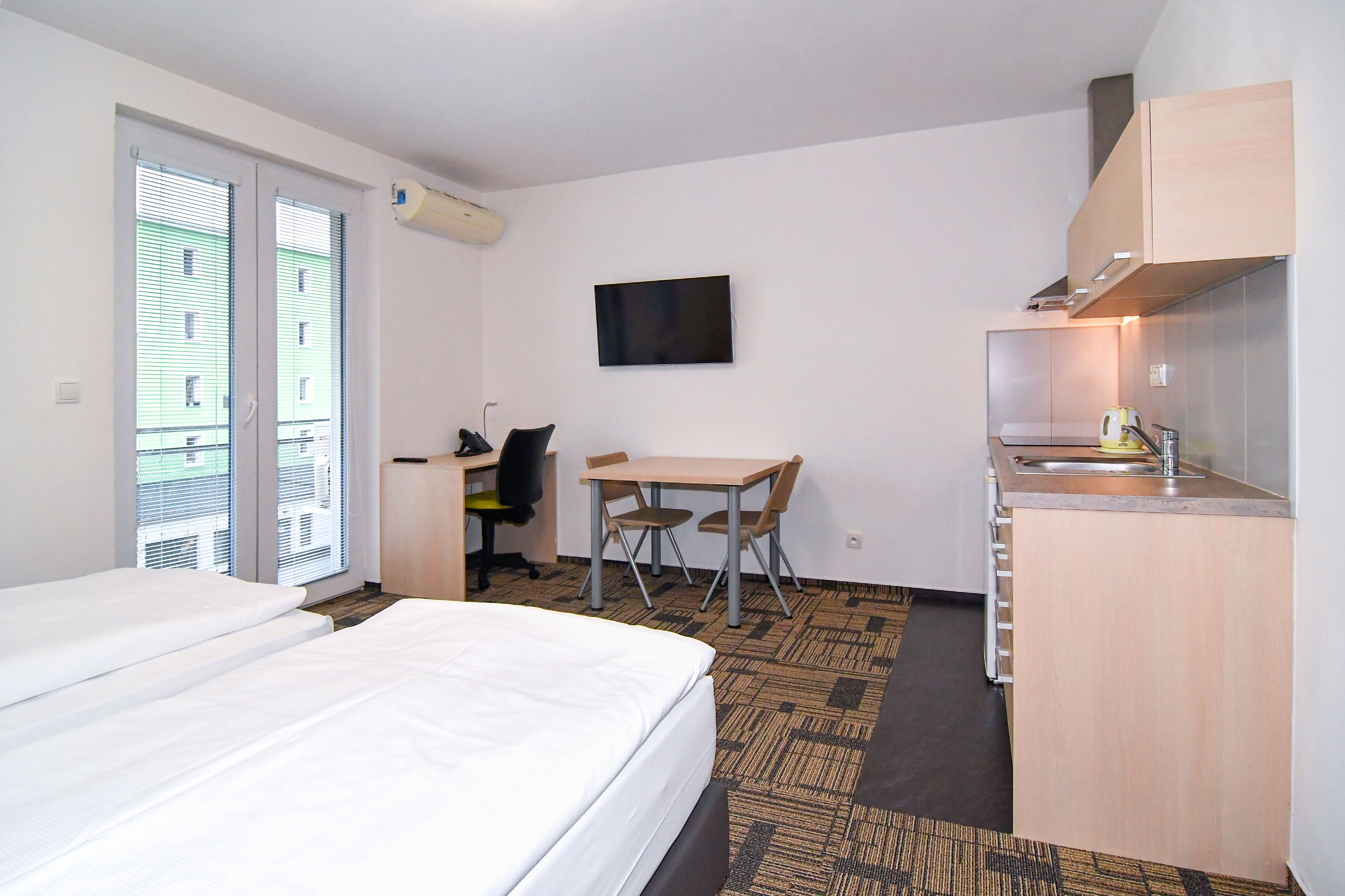 Byty 1+kk jsou o výměře od 33,14 do 47,25 m2 a nacházejí se ve 2.-5. podlaží. Byty jsou vybaveny klimatizačními jednotkami zn. Samsung, včetně dálkového ovládání. Budova je opatřena výtahem i schodištěm. Byt má vstupní chodbu vybavenou vestavěnou šatní skříní s celoplošným zrcadlem a pokojovým trezorem. Dále byt disponuje vlastní klimatizací, moderní vybavenou kuchyňskou linkou s pracovní deskou, podstavnou lednicí indesit, vestavěnou mikrovlnou trouba s grilem a horkovzdušnou troubou, varnou konvicí a jídelní soupravou s nádobím pro 2 osoby. Pokoj je vybavený jídelním stolem se 2 židlemi, pracovním stolem s kancelářskou židlí a smart TV. V pokoji je luxusní postel King Koil s možností uspořádání postelí odděleně nebo jako manželská postel. Koupelna může být s vanou nebo sprchovým koutem, umyvadlem, wc a topným žebříkem. Z pokoje je vstup na balkon orientovaný do vnitrobloku. WiFi připojení se standardní rychlostí dat je již v ceně pronájmu.