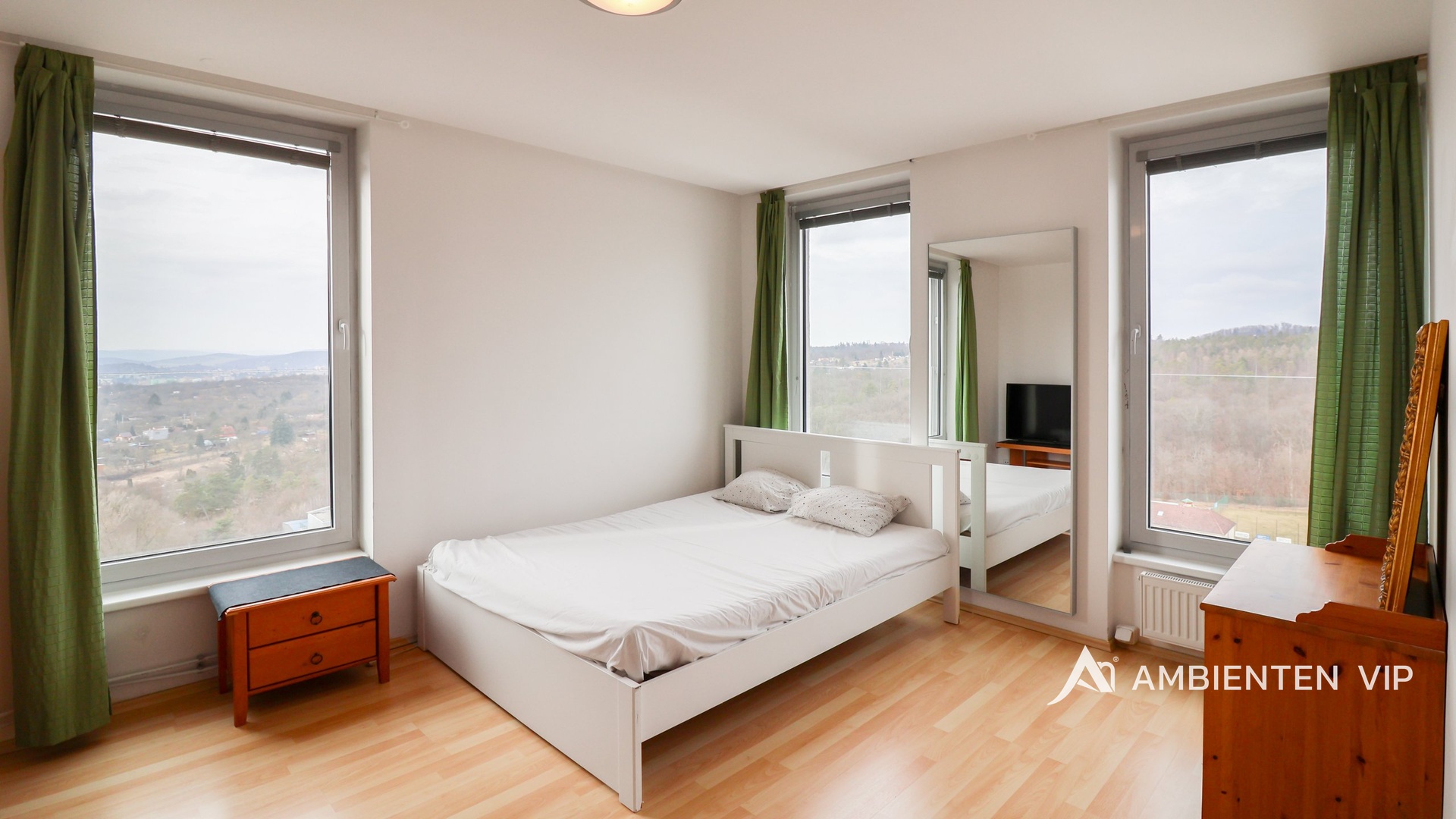 Součástí zařízeného obývacího pokoje je jídelní stůl z masivu s šesti židlemi, které jsou nově čalouněné, elektrické masážní křeslo, dvě dřevěná křesla společné s konferenčním stolkem. V horní části bytu se nachází dvě ložnice a již zmiňovaná koupelna s vanou. Ložnice jsou plně vybavené, kdy v menší ložnici se nachází jednolůžková postel s křeslem, skříni a je ji možné využít i jako pracovnu, nebo dětský pokoj. Ve větší ložnici se nachází dvojlůžková manželská postel, menší skříň z masivního dřeva a chytrá televize. Ve vstupní chodbě v horní části bytu se nachází velká prostorná skříň pro uložení Vašich potřeb.
