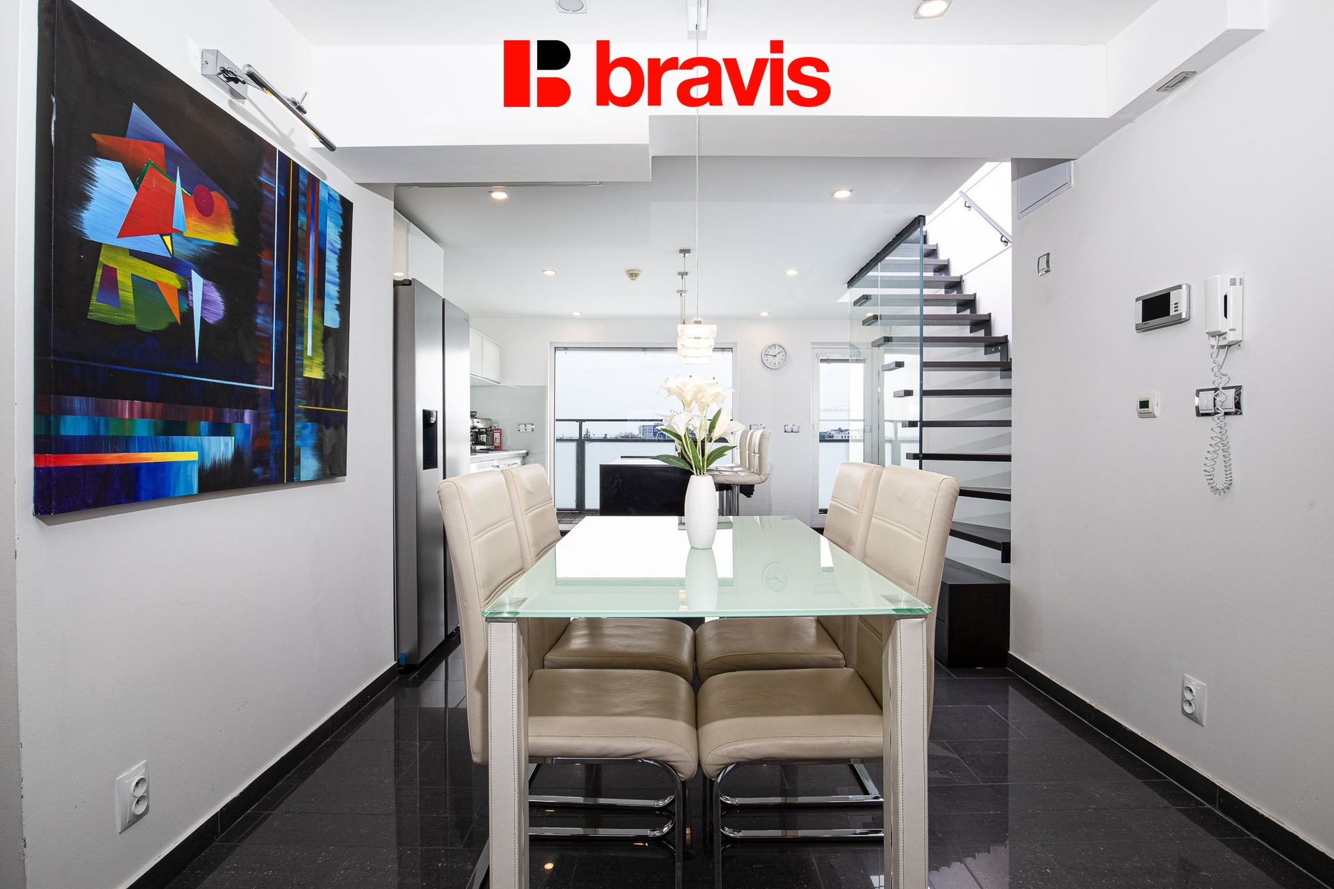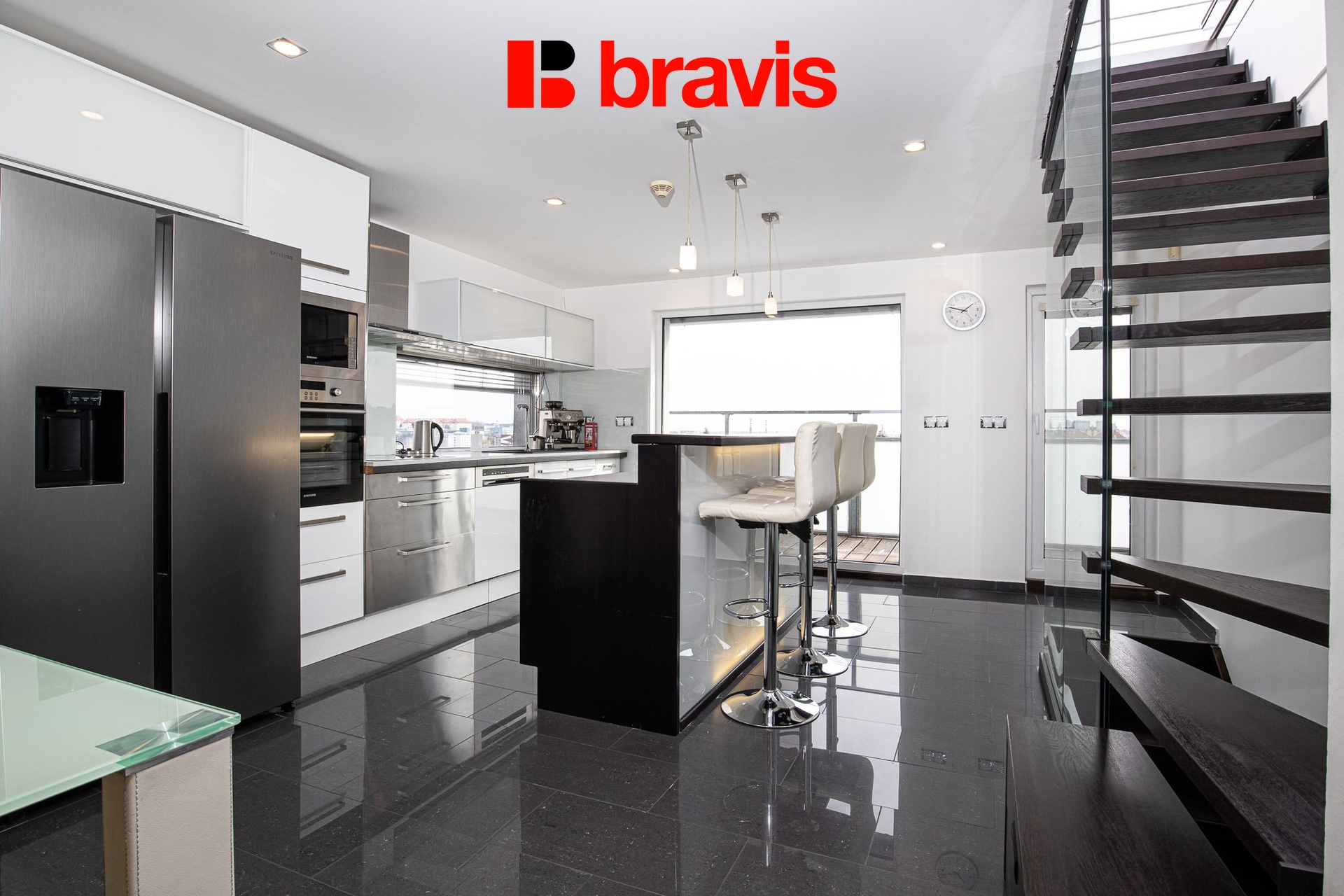 Srdcem bytu je otevřená kuchyně s obývací částí v prvním patře – vybavena kuchyňskou linkou na míru se spotřebiči (americká lednice se zásobníkem ledu, mikrovlnka, rychlovarná konvice, myčka, varná deska, el. trouba) a barovým pultem s židlemi.