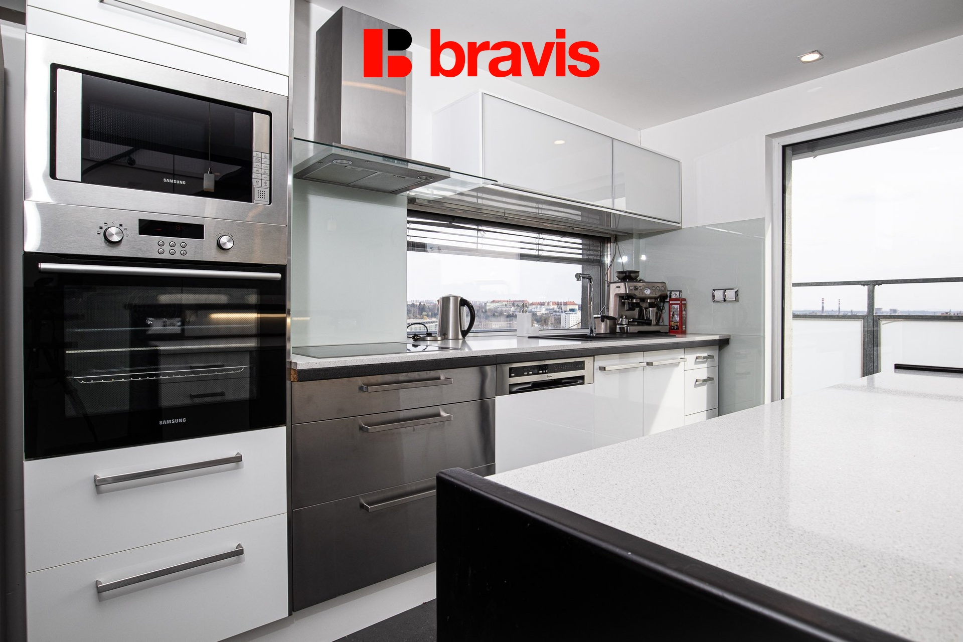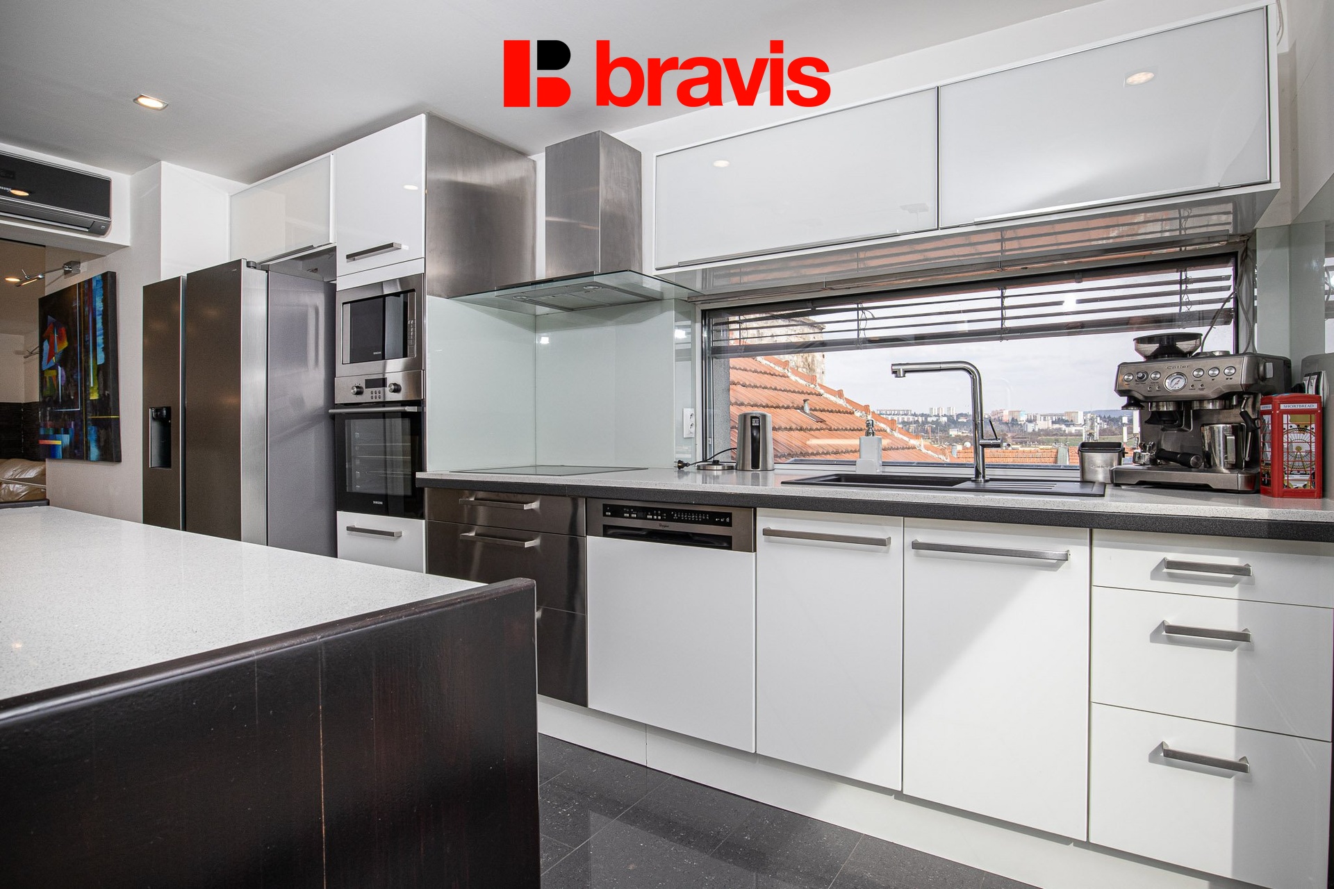 Z kuchyně je přístup na prostornou střešní terasu 39 m2 s možností posezení a výhledem na panorama Brna – skutečná rarita v centru města.
