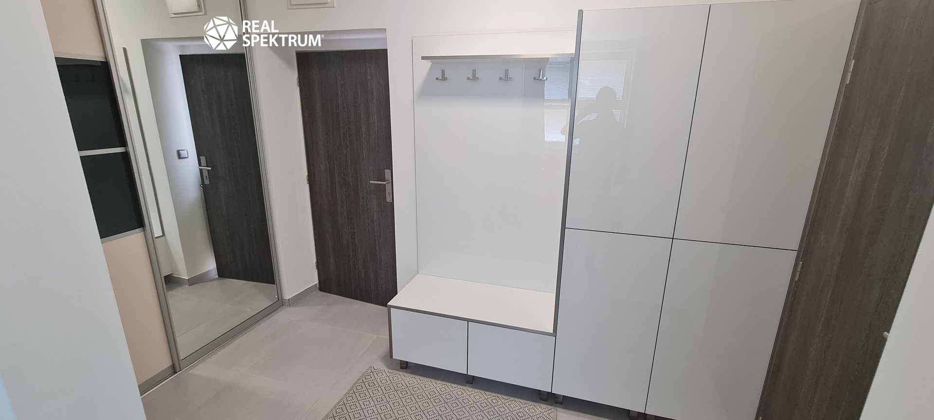 Byt se nabízí vybavený, kde se nachází kuchyňská linka se spotřebiči (varná deska, trouba, digestoř, myčka, mikrovlnka, lednička s mrazničkou), manželská postel, jídelní stůl, židle, pohovka a ve vstupní chodbě najdete velkou vestavěnou skříň a další úložné prostory. Koupelna je vybavena pračkou, sprchovým koutem, umyvadlem a toaletou.