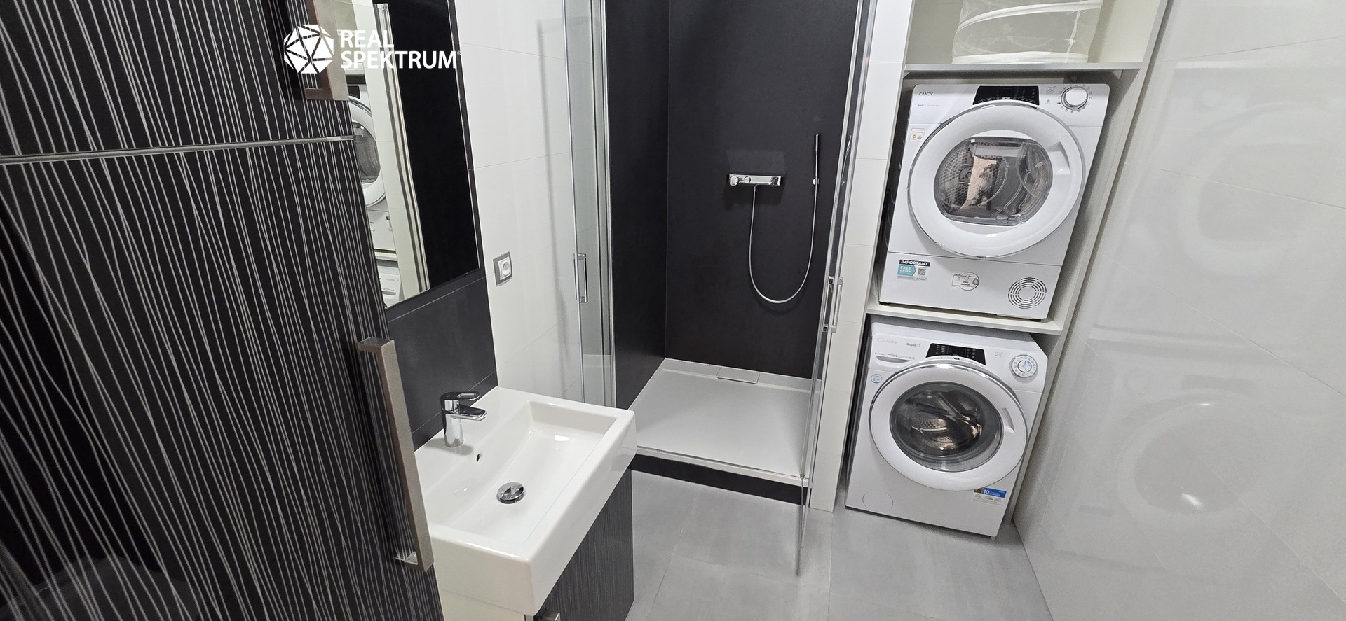 Koupelna je vybavena pračkou, sprchovým koutem, umyvadlem a toaletou.