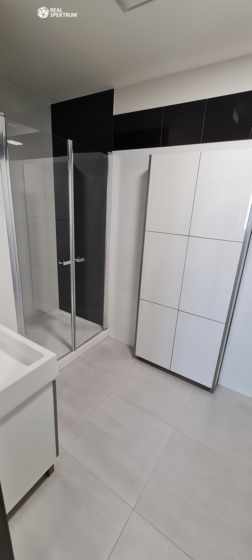Koupelna je vybavena pračkou, sprchovým koutem, umyvadlem a toaletou.