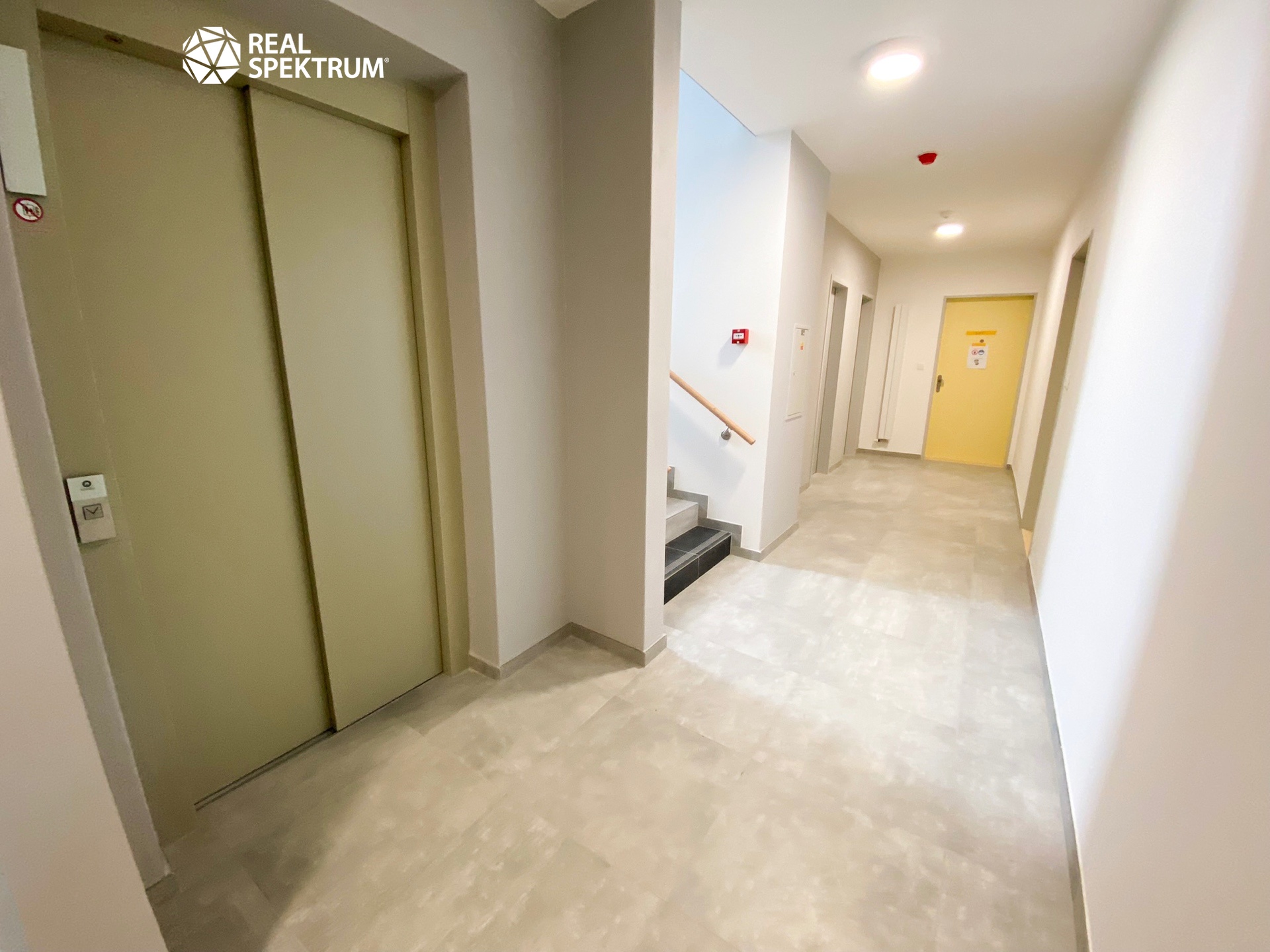 Tento naprosto skvělý byt se nachází ve druhém podlaží bytového domu s výtahem. Jak bylo zmíněno - k bytu náleží sklep 5 m², garážové stání a balkón 13,4 m².