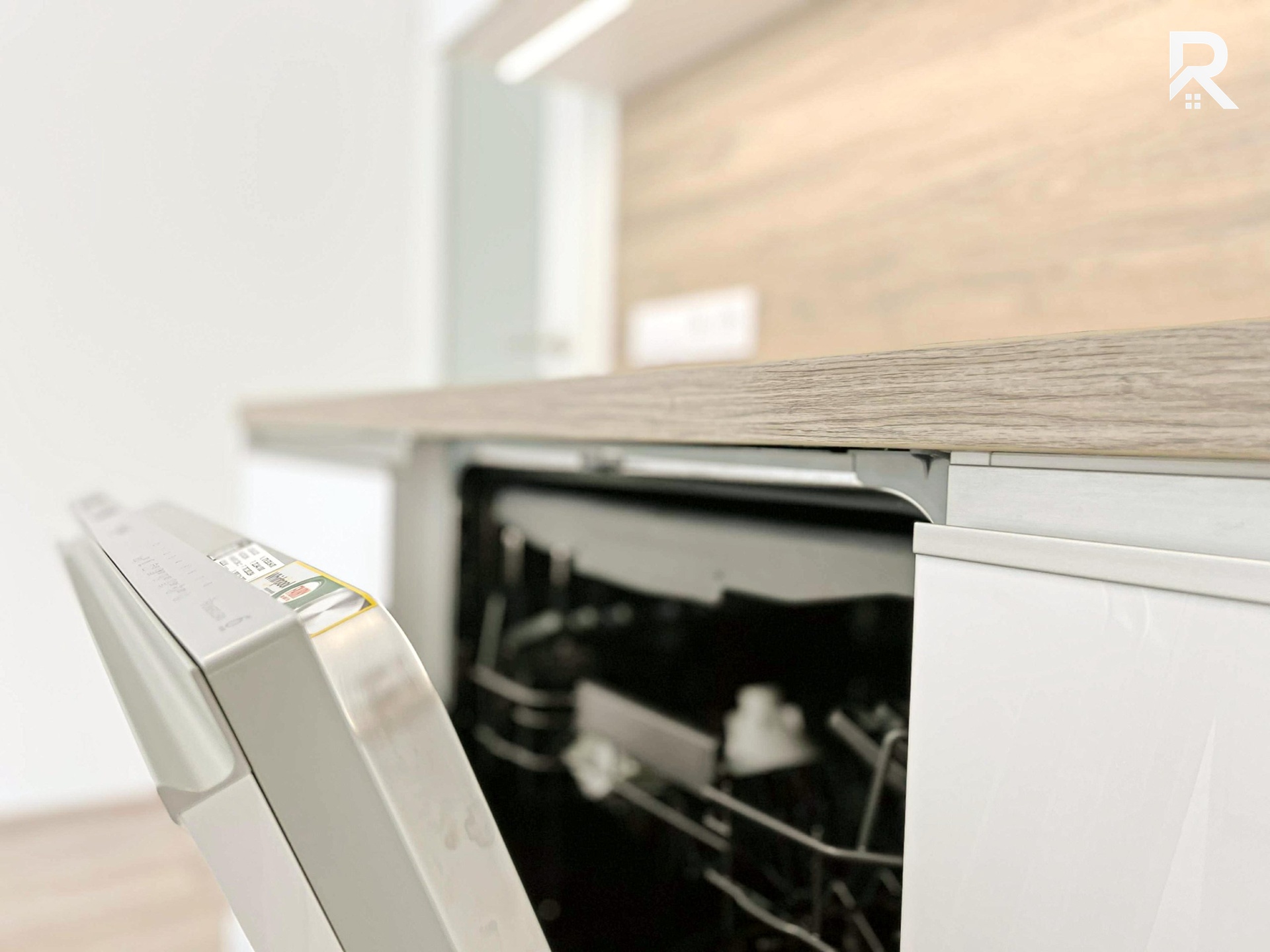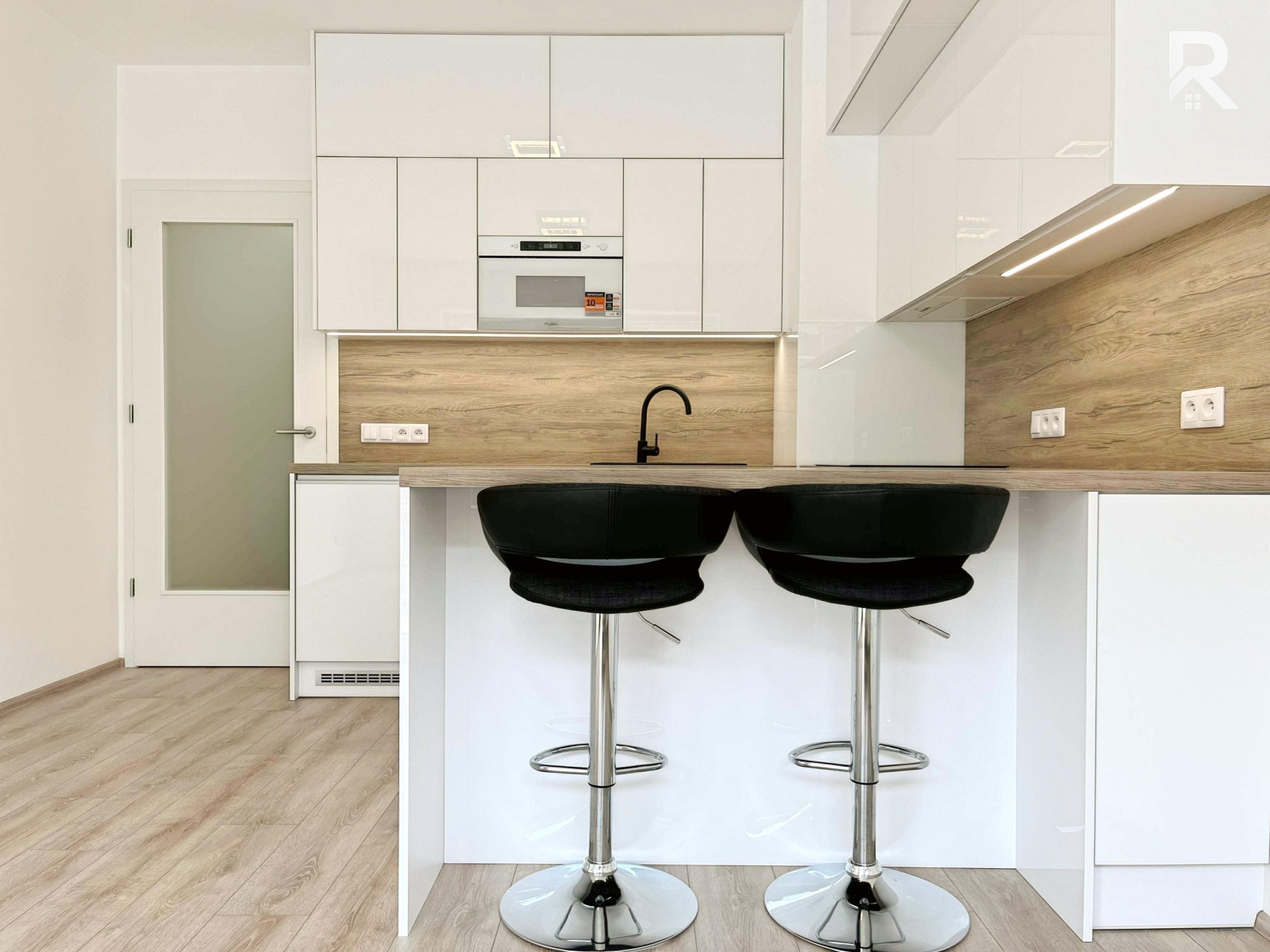 V samotném bytě Vás uvítá chodba s vestavěnými prvky jako je lavice, odklad na kabáty a také úložný prostor, kterého není nikdy dost. Naší první zastávkou je designová koupelna se skříňkou i zrcadlem na míru, nachází se zde také závěsné WC, pračka a také sprchový kout. Samotnému obývacímu prostoru s kuchyňským koutem skutečně dominuje kuchyňská linka od truhláře na míru, která disponuje spotřebiči jako je indukční deska, menší lednice s mrazákem, myčka, mikrovlnná trouba a samozřejmě také horkovzdušná trouba. Pokud tedy rádi vaříte, nic Vám nebude chybět ke spokojenosti. Vzhledem k tomu, že se zde myslelo skutečně na vše, nachází se zde také prodloužení v rámci kuchyňské linky a barových židliček. Prostor je navržený tak, že v případě toho, že si pořídíte kancelářskou židli, budete to brát jako plnohodnotnou pracovnu. K úplnému štěstí Vám bude již chybět jen postel či případně rozkládací gauč, který si do prostoru můžete navrhnout dle Vašich představ.