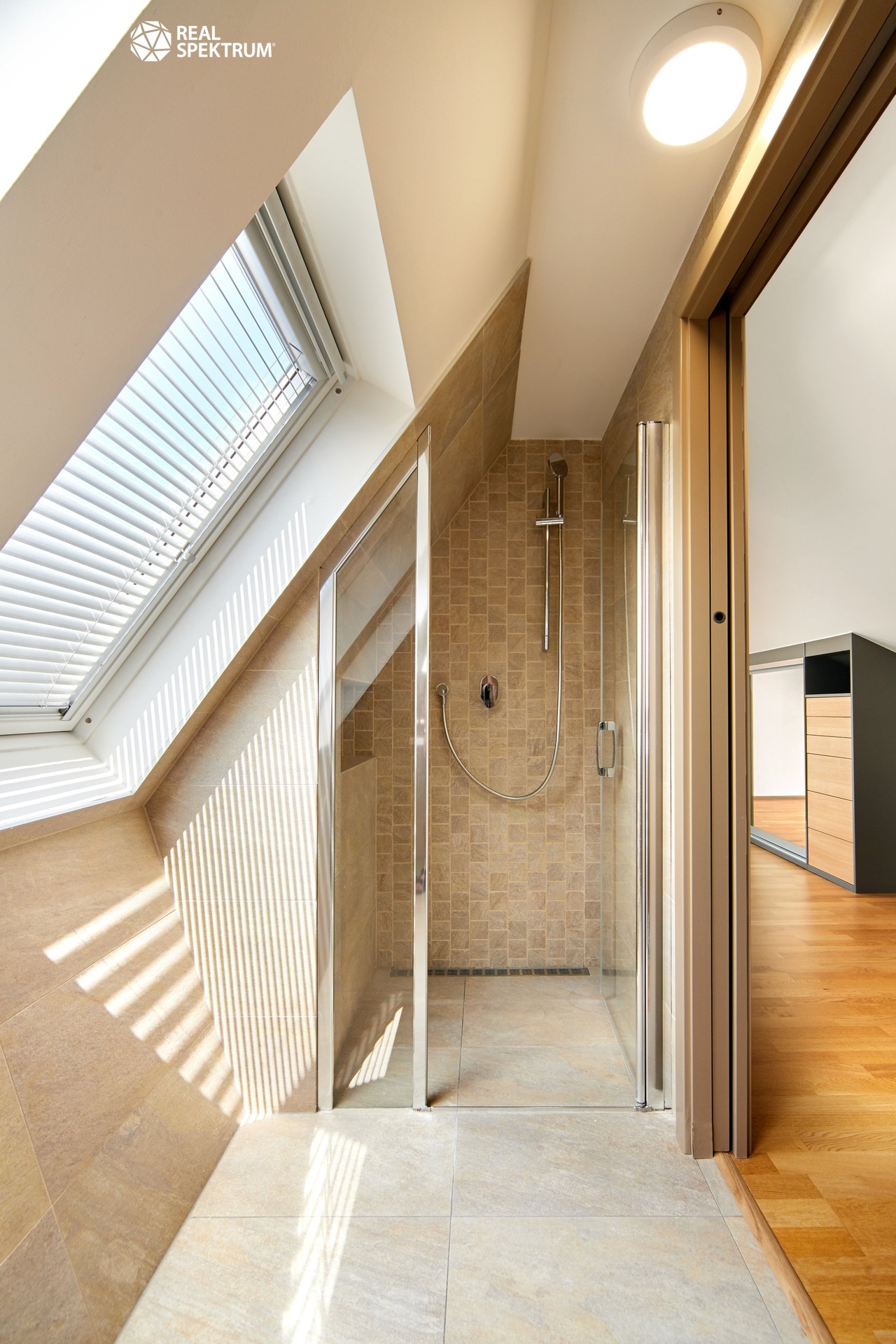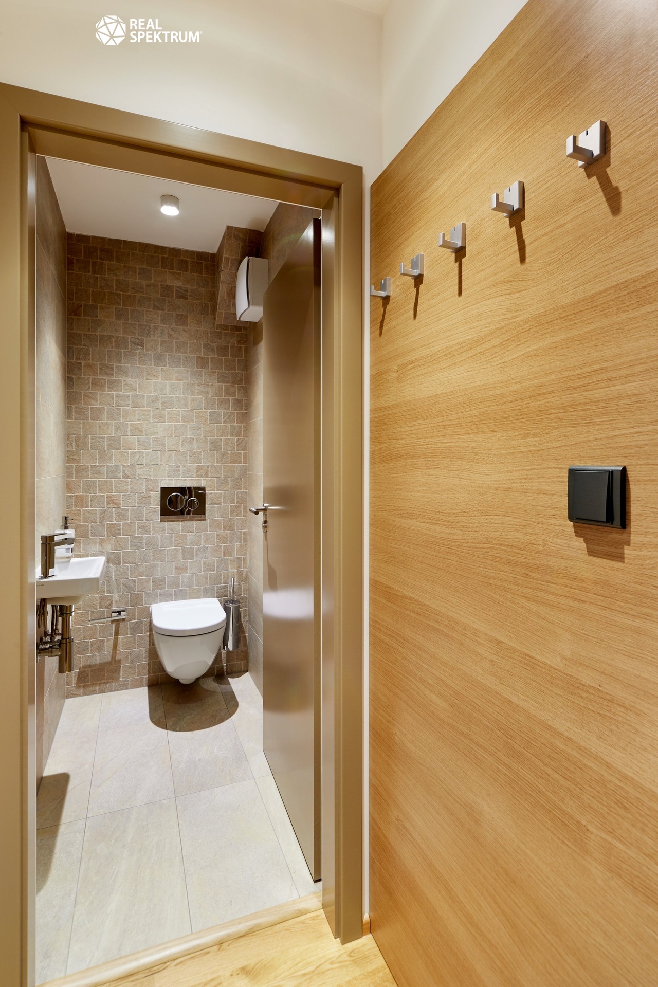 Koupelna je vybavena sprchovým koutem, umyvadlem a toaletou.