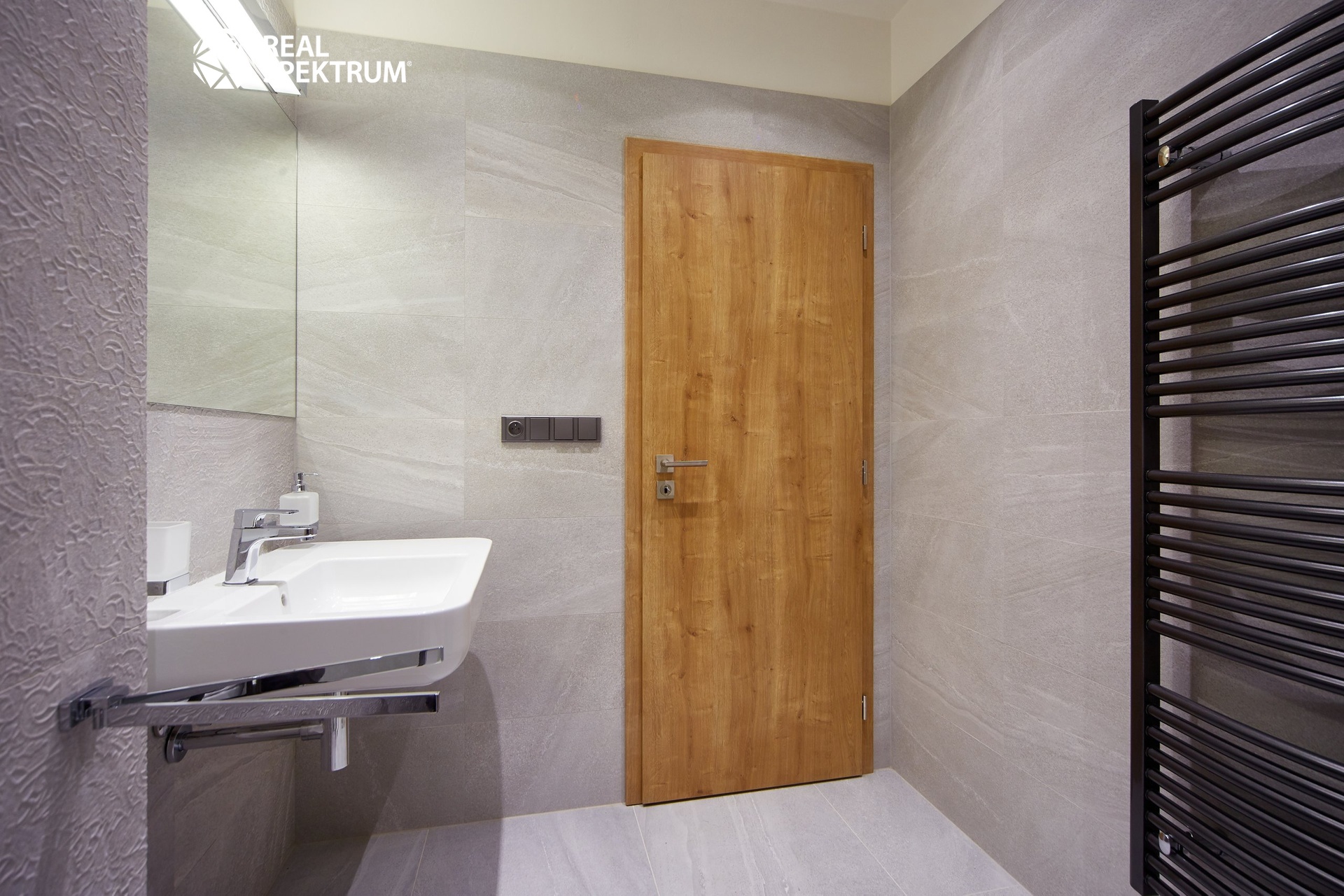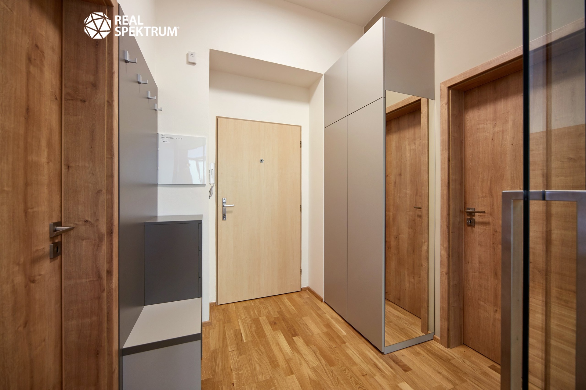 Nechybí zde šatna s pračkou a další úložné prostory jsou na chodbě bytu. Koupelna je vybavena vanou, sprchovým koutem, umyvadlem a toaletou. Možnost parkování v garáži za příplatek.