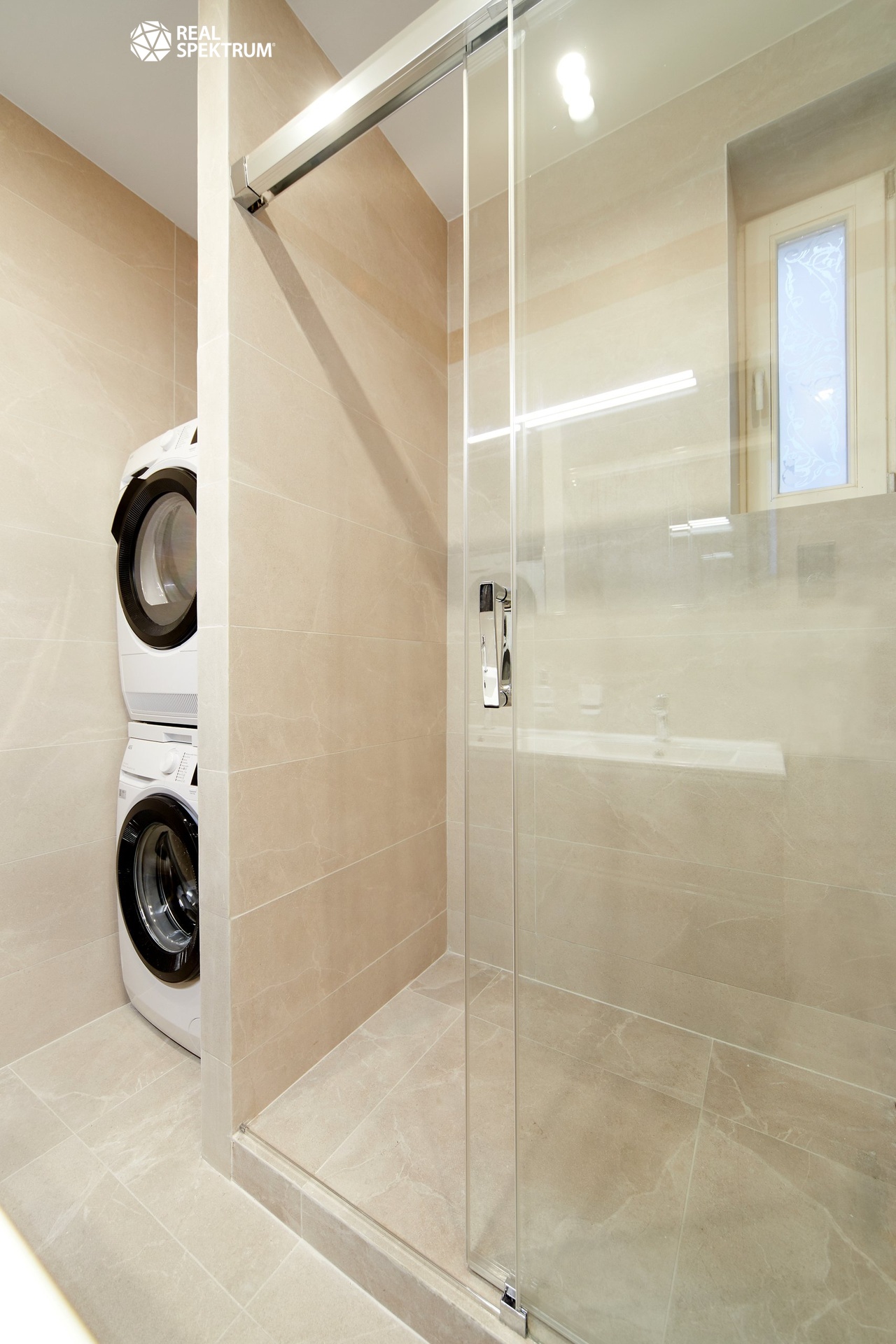 Koupelna je vybavena sprchovým koutem, dvěma umyvadly, pračkou a sušičkou. Toaleta je oddělena.
