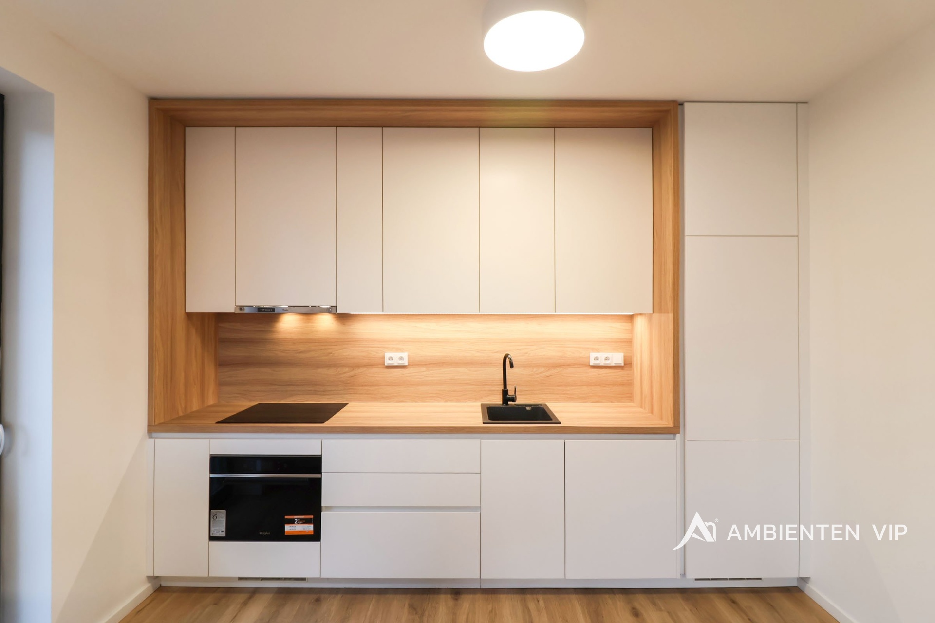 Moderní kuchyňská linka s vestavěnými spotřebiči Whirpool (indukční deska, horkovzdušná trouba, mikrovlnná trouba, lednice, mraznička, myčka, odsavač par).