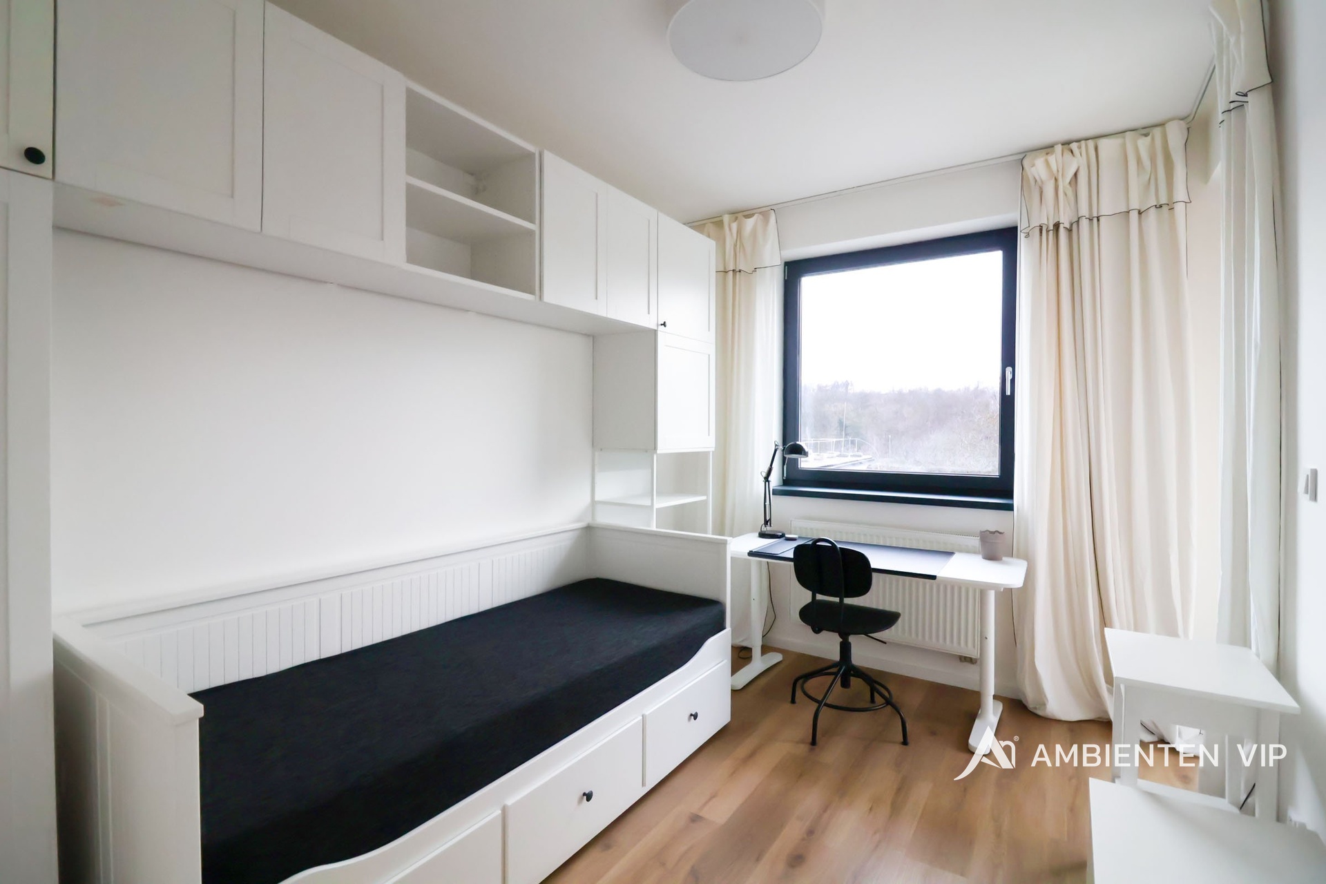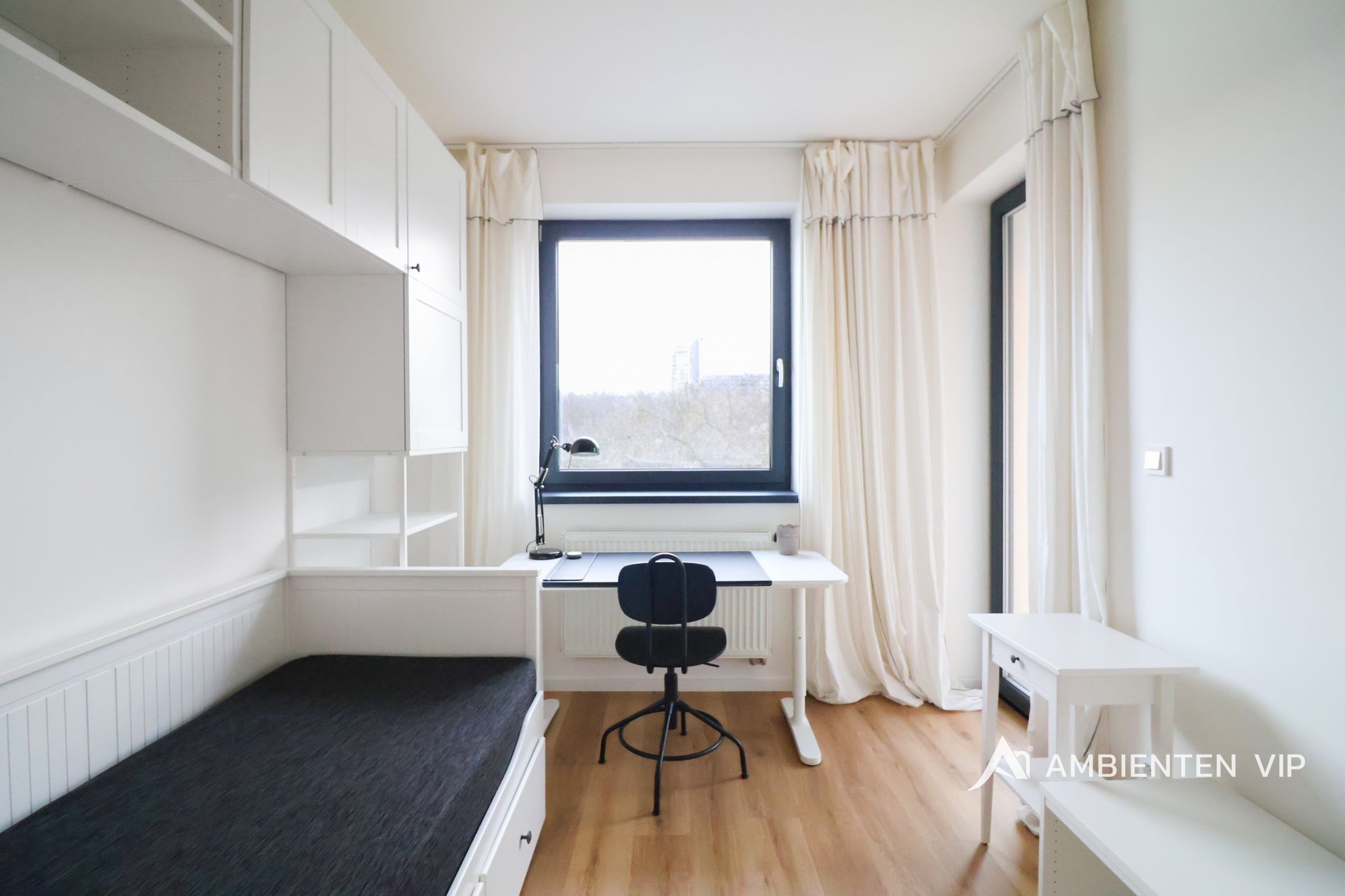 Pokoje jsou vybaveny postelemi 200x140cm, pracovním stolem se židlí a stolkem pro tiskárnu, v celém bytě i pokojích jsou vestavěné skříně pro dostatek úložného prostoru.