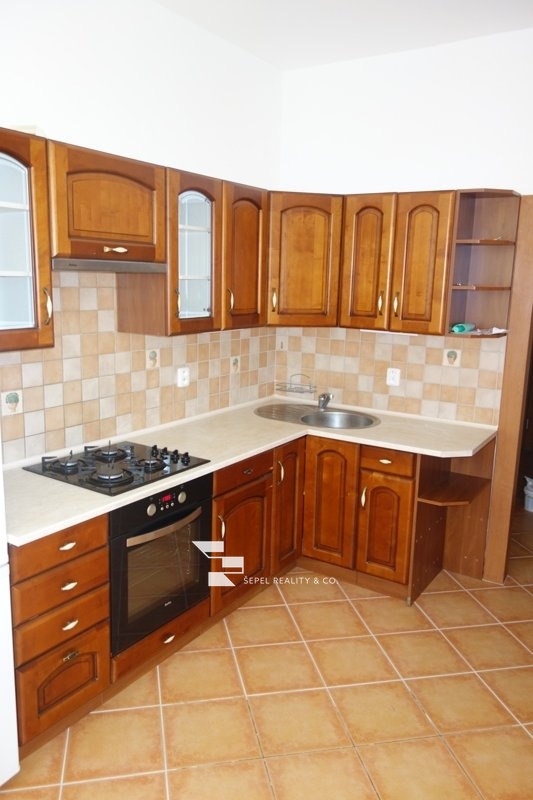 Kuchyňská linka, plynová varná deska a elektrická trouba,, digestoř, lednice s mrazákem, jídelní stůl a 4x židle. Je zde i komora.