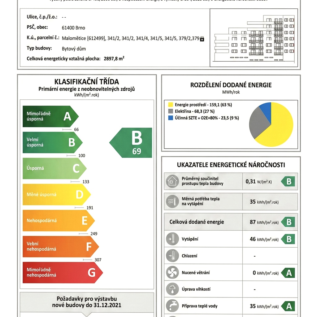 Ukazatel energetické náročnosti budovy:69 kWh/m²