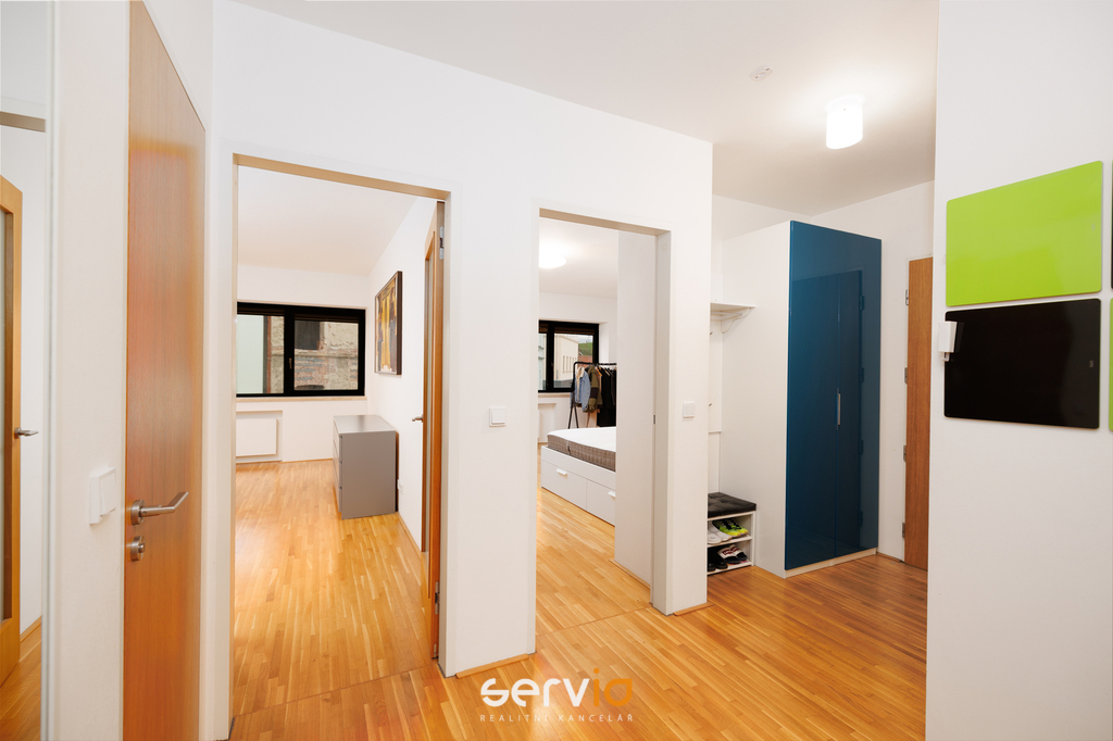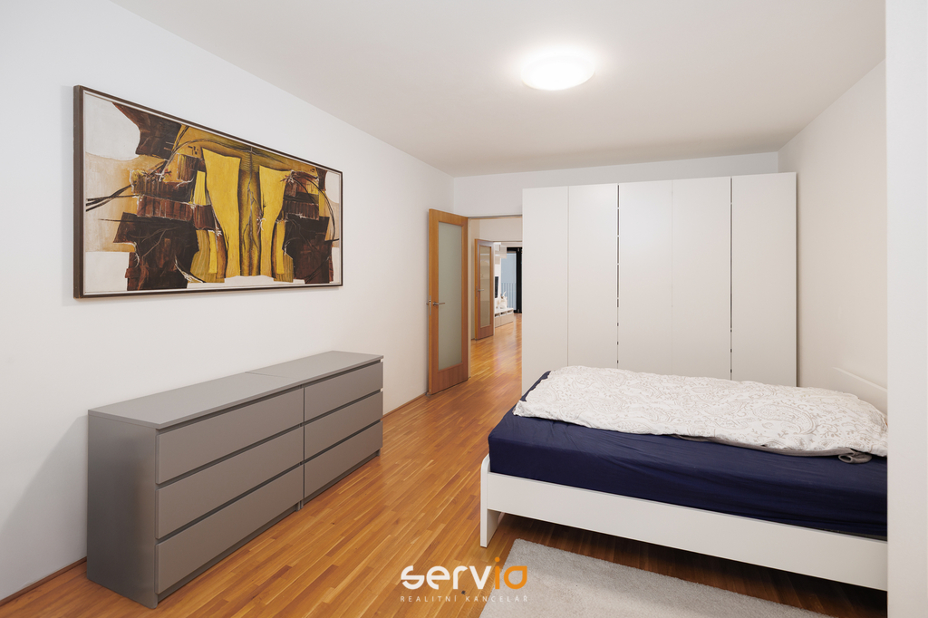 Celková podlahová plocha bytu 99,4 m2, plus balkon (9,08 m2) a sklepní kóje (2,92 m2), možnost pronájmu parkovacího stání v podezmních garážích.