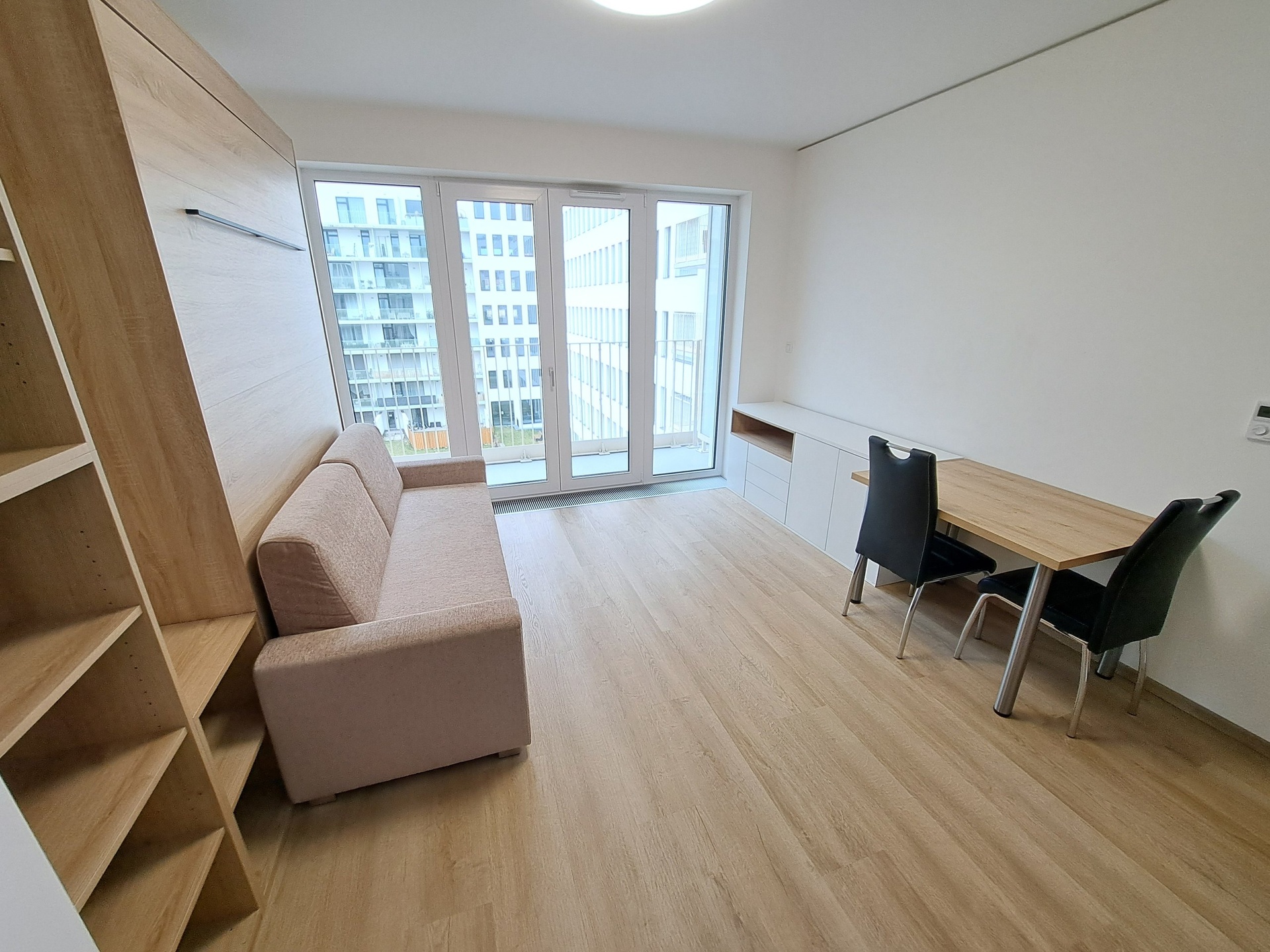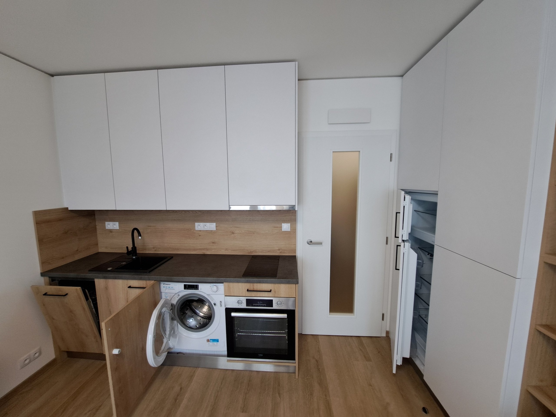 Obývací pokoj s kk (jídelní stůl + 2 židle, TV skříň, víceúčelová sklápěcí dvoulůžková postel s pohovkou, policová skříň, skříň). Kuchyňská linka se spotřebiči (vestavěná lednička s mrazákem, indukční varná deska, digestoř GORENJE, elektrická trouba BEKO, myčka 60 cm BEKO, pračka CANDY, dřez + vodovodní baterie, horní a dolní skříňky).
