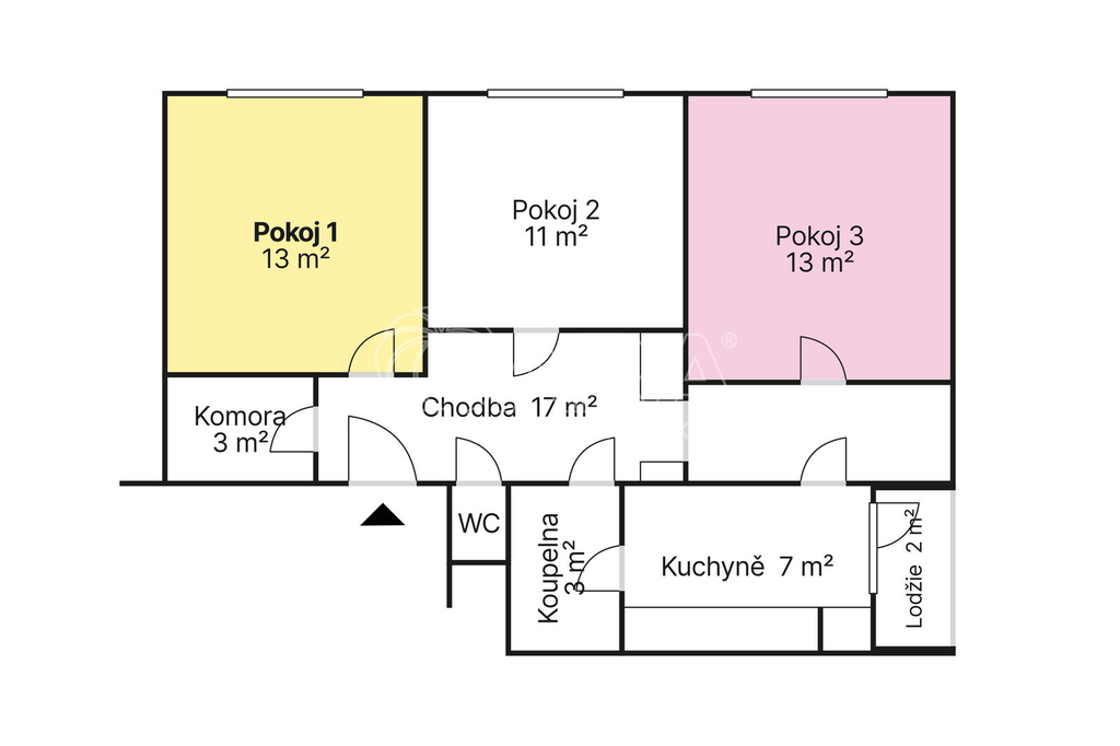 První místnost o velikosti 13 m² je vybavena dvoulůžkovou postelí včetně matrace, 2 skříněmi, věšákem, pracovním stolem, kancelářskou židlí, lampou a televizí. K dispozici od 1. dubna (v půdorysu pokoj č. 1, žlutý).