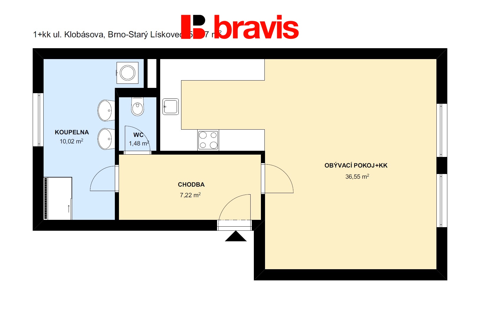 Byt je dispozičně řešen vstupem do zádveří sloužícího jako předsíň, ze které lze vstoupit do velkého pokoje s kuchyňským koutem. Kuchyňská část je vybavena linkou, varnou deskou, troubou a digestoří.