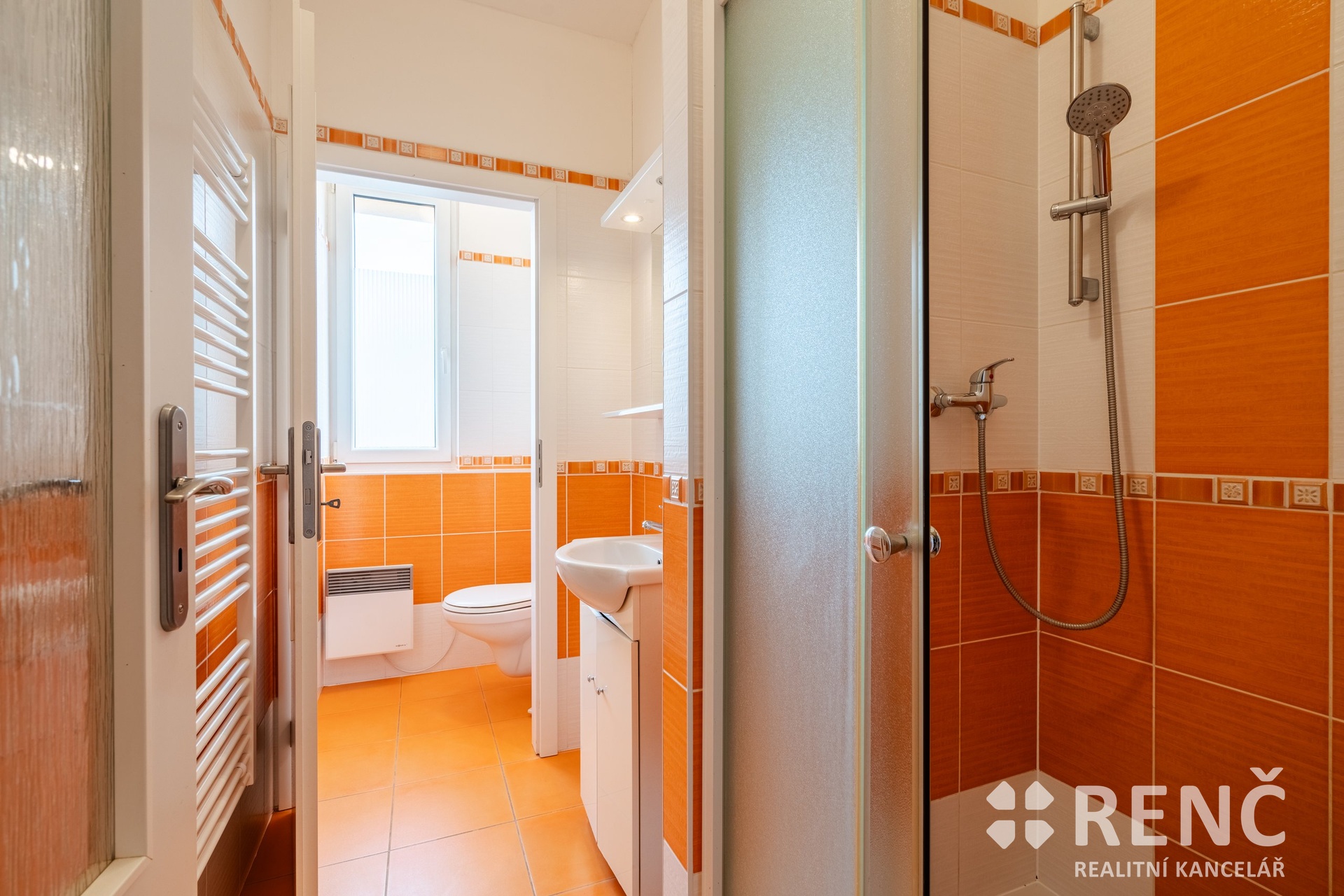 K pronájmu nabízíme byt o velikosti 1+kk, umístěný ve III. podlaží zděného domu v klidné části ulice Kamenomlýnská v Brně Pisárkách. Celková podlahová plocha bytu činí 36 m2. Byt se nachází v podkroví domu a je přístupný po vnitřním domovním schodišti. Z předsíně bytu je samostatně přístupný pokoj s kuchyňským koutem a také koupelna s odděleným WC. Byt je vybaven kuchyňskou linkou se zabudovanou varnou deskou, lednicí, mikrovlnnou troubou, vestavěným nábytkem (šatní skříň, policové skříňky, věšáková stěna a botník v předsíni), pračkou a stolem se židlemi. V obytné místnosti je položena vinylová podlaha. Okno v kuchyňském a jídelním koutě je plastové včetně žaluzií, okno do ulice ve zkoseném stropě je střešní Velux včetně zastínění. V bytě je vlastní elektrické regulovatelné topení, ohřev vody je zajištěn elektrickým bojlerem. Do bytu je zaveden internet a televizní signál (STA). Byt je vhodný pro 1 osobu.