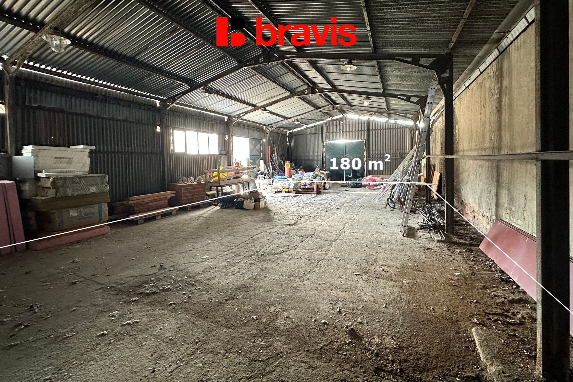 Plechová hala má podlahovou plochu 180 m². Ideuální pro uložení stavebního materiálu, techniky, skladování zboží apod.