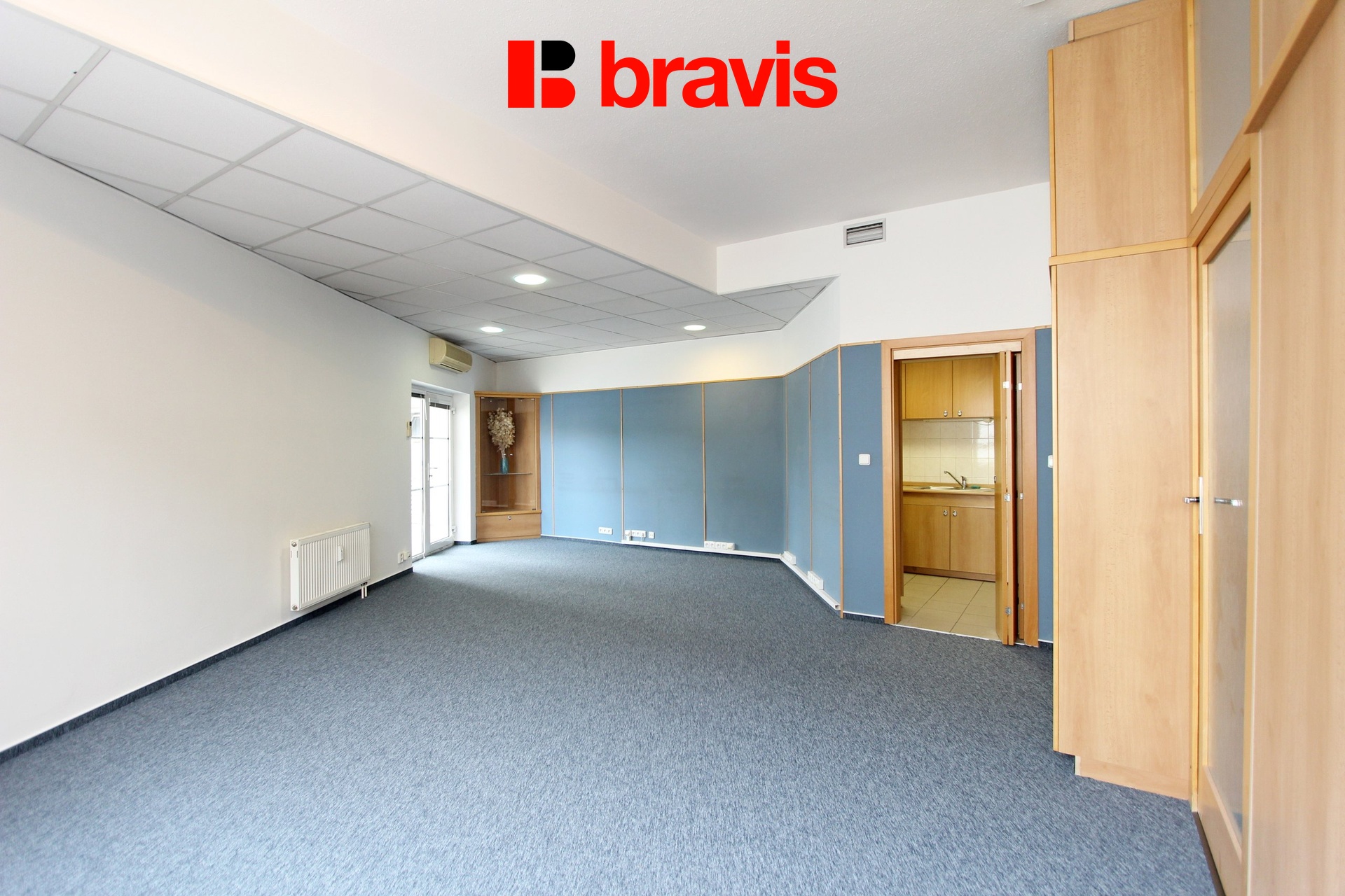Pronájem světlé a prostorné kanceláře 84 m² s velkou lodžií, kuchyňkou a koupelnou – klimatizace, dv