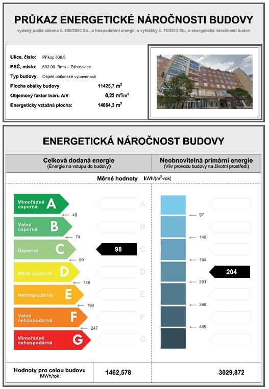 Ukazatel energetické náročnosti budovy:98 kWh/m²