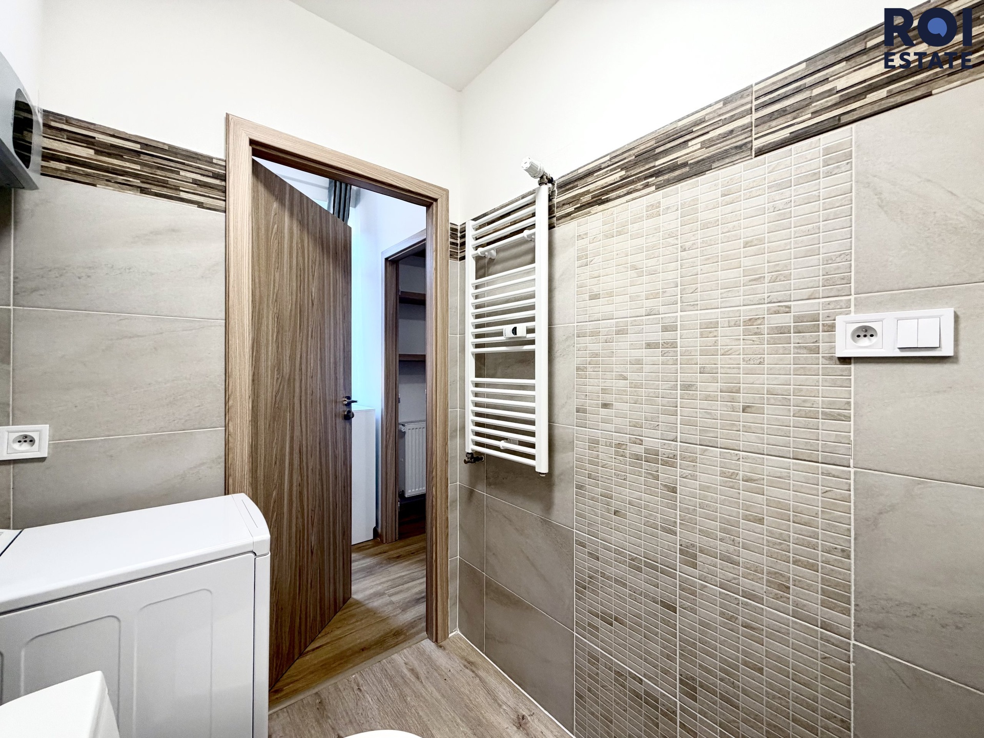 V koupelně je k dispozici pračka a koupelnová skříňka, v předsíni poté praktický botník.